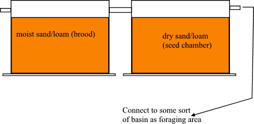 I do like your idea tho a lot, however i think i would the moist and the dry part connected to a foraging area.. Have to say cant wait to see pics of he finished thing.. Just remember most messors like it hotter than normal European ants. ;)
