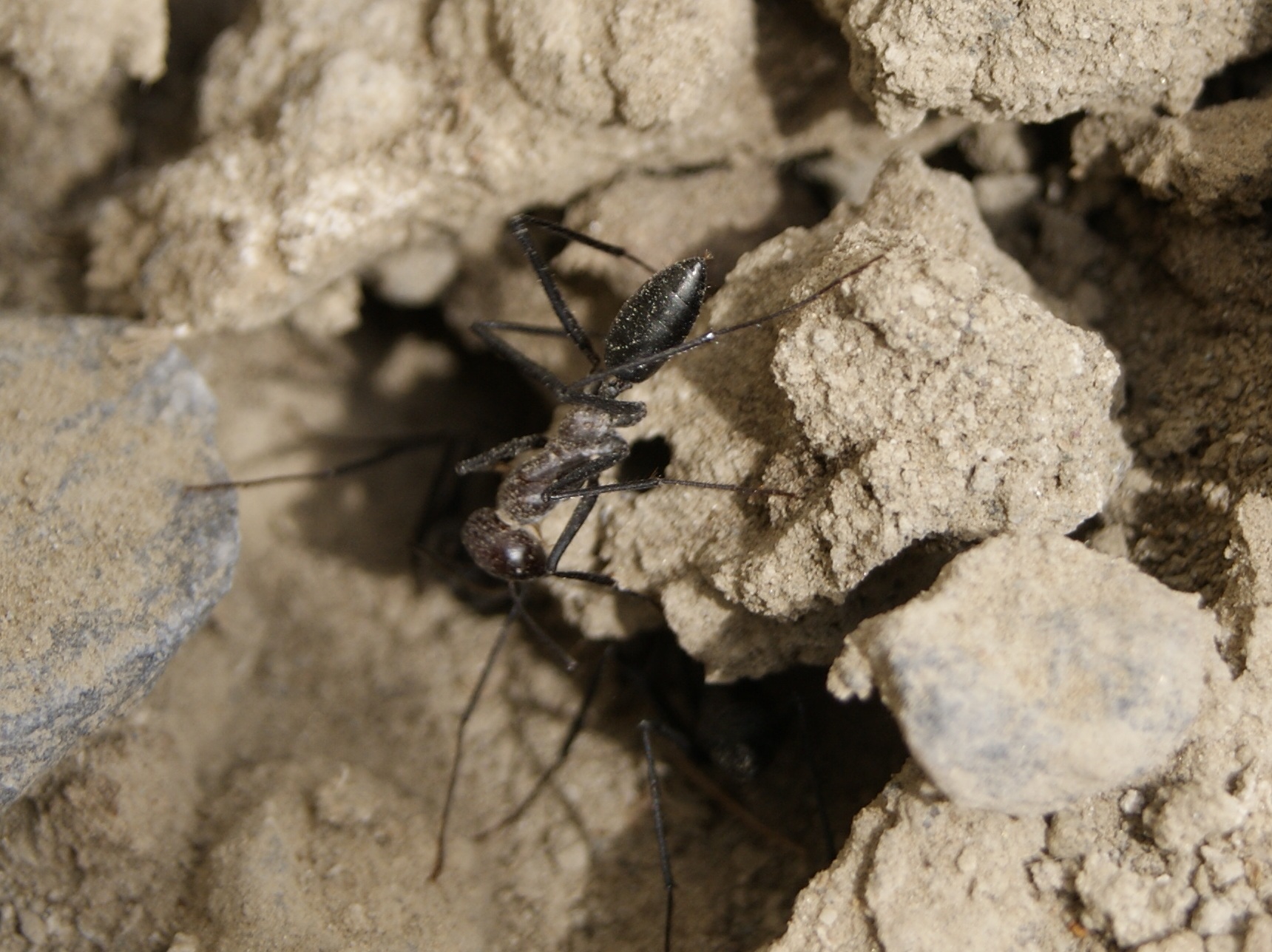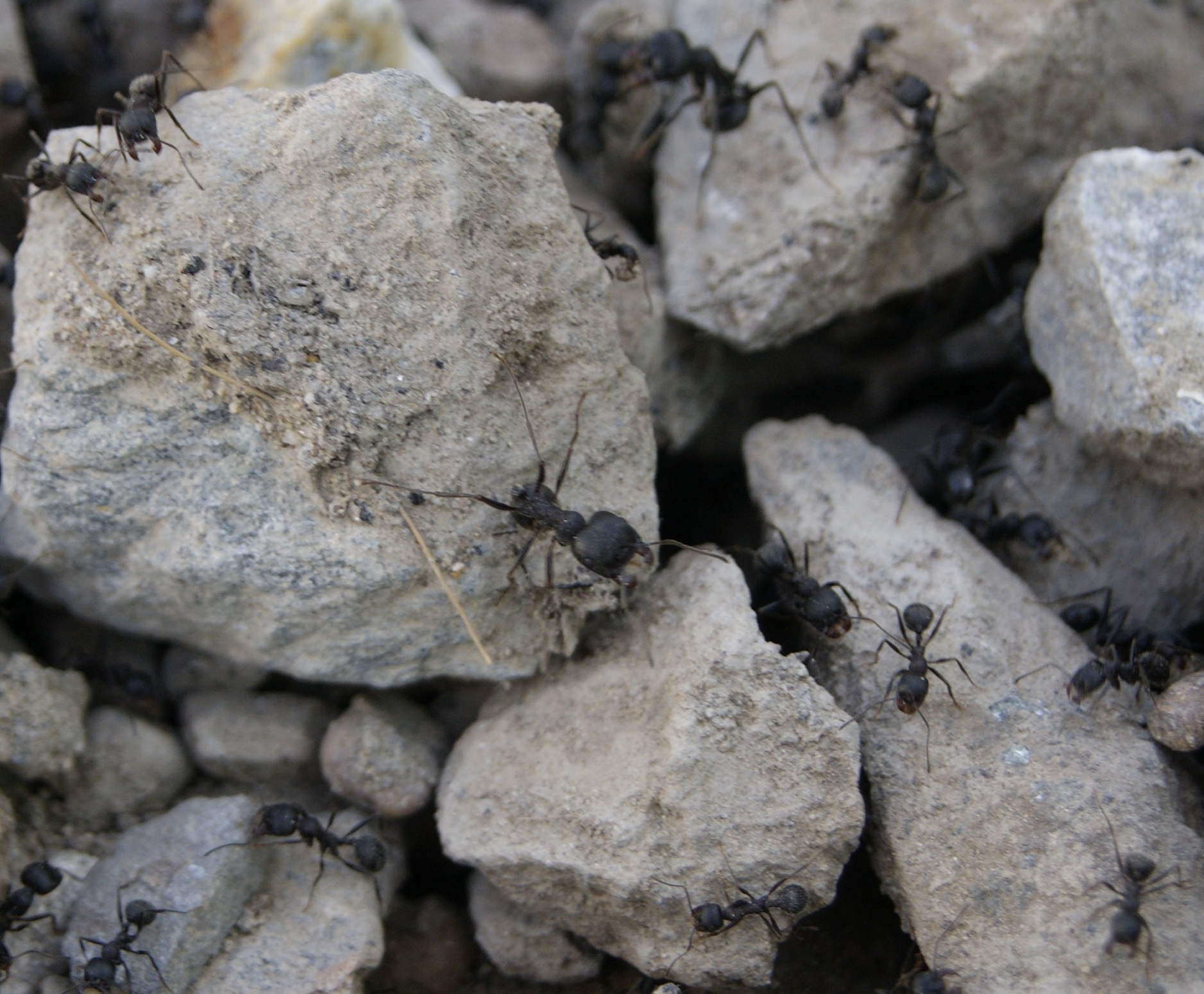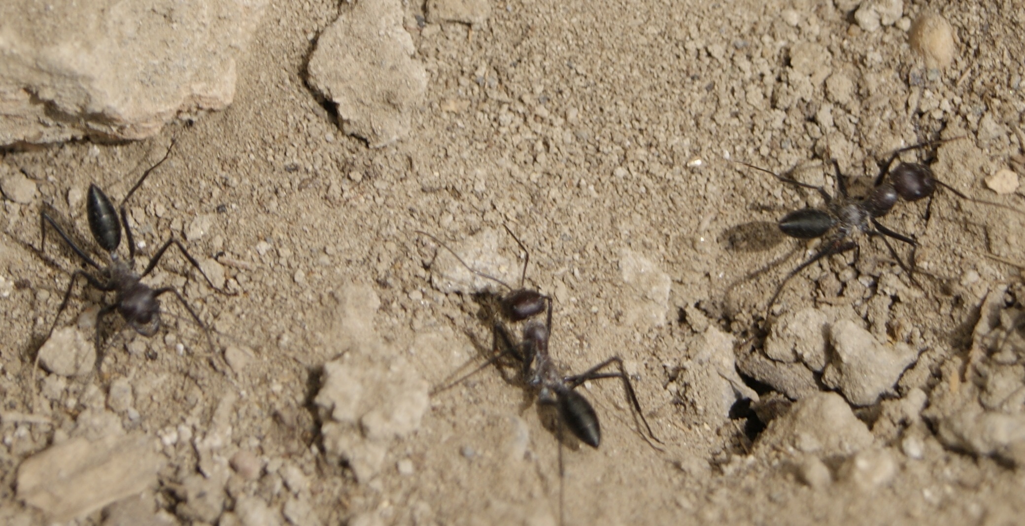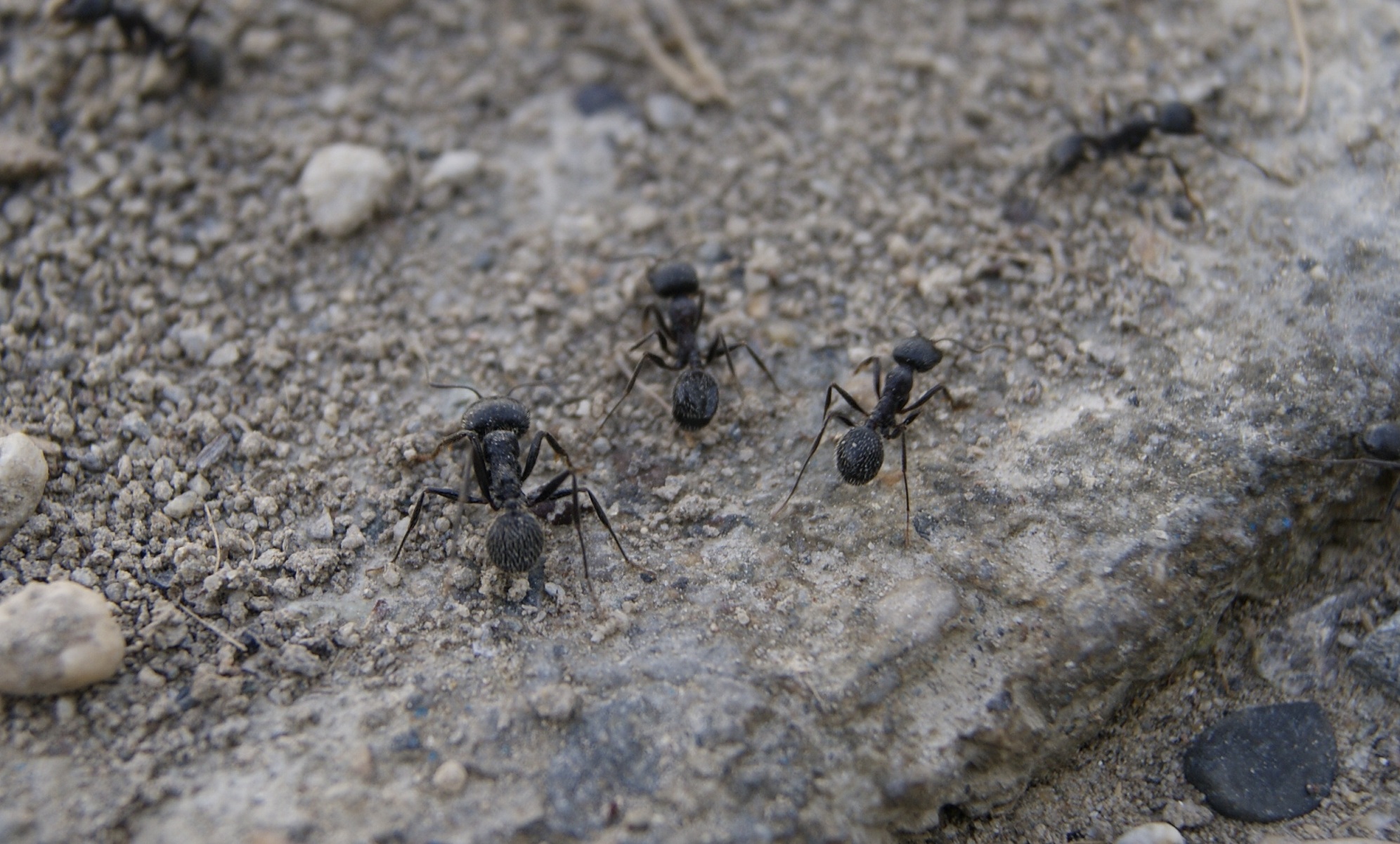 Die Ameise mit der hochgestreckten Gaster, eine hübsche Cataglyphis. Die restlichen Arbeiterinnen gehören zu Messor, bei den Alaten bin ich mir nicht sicher, könnte auch Messor sein.