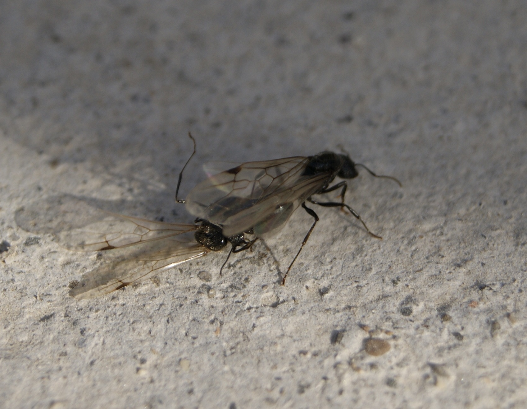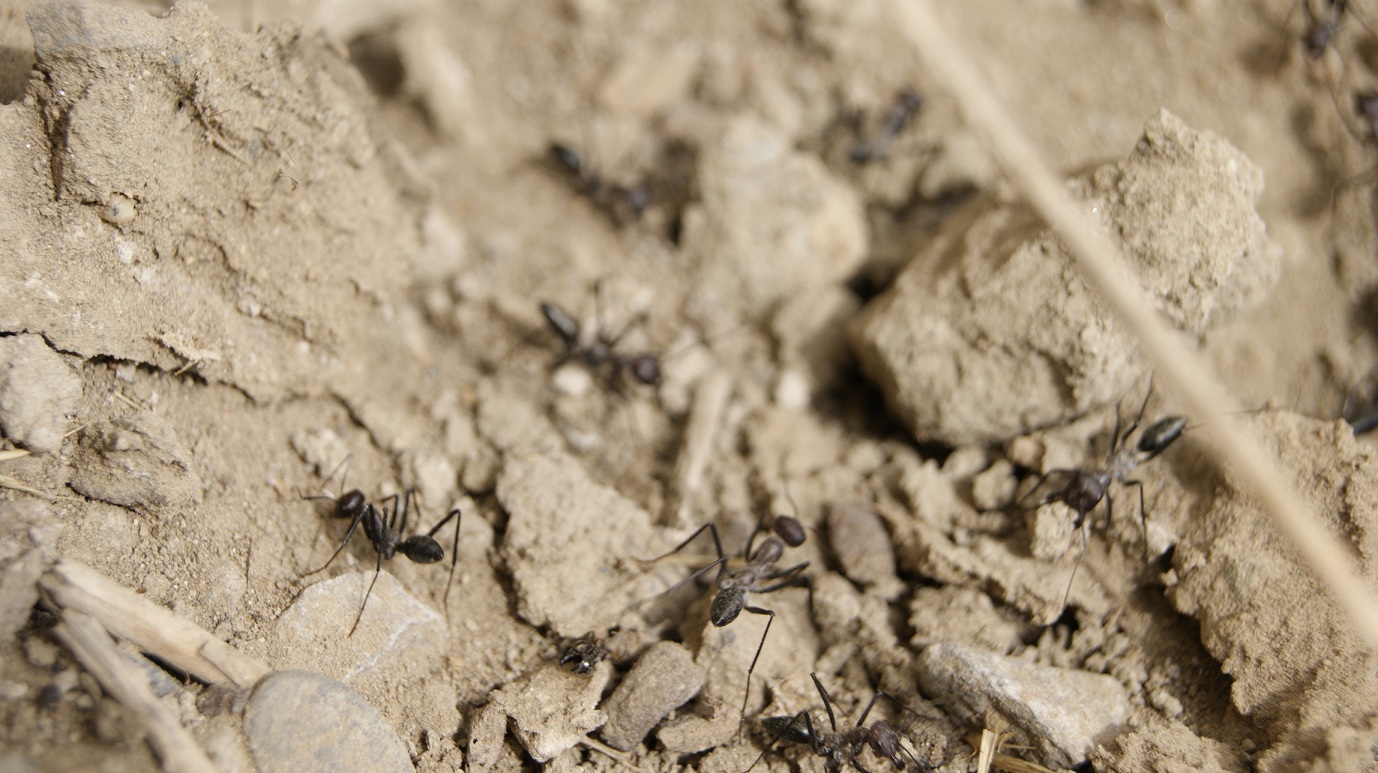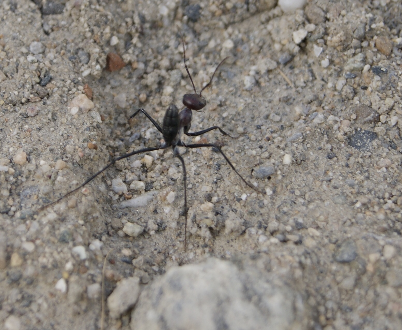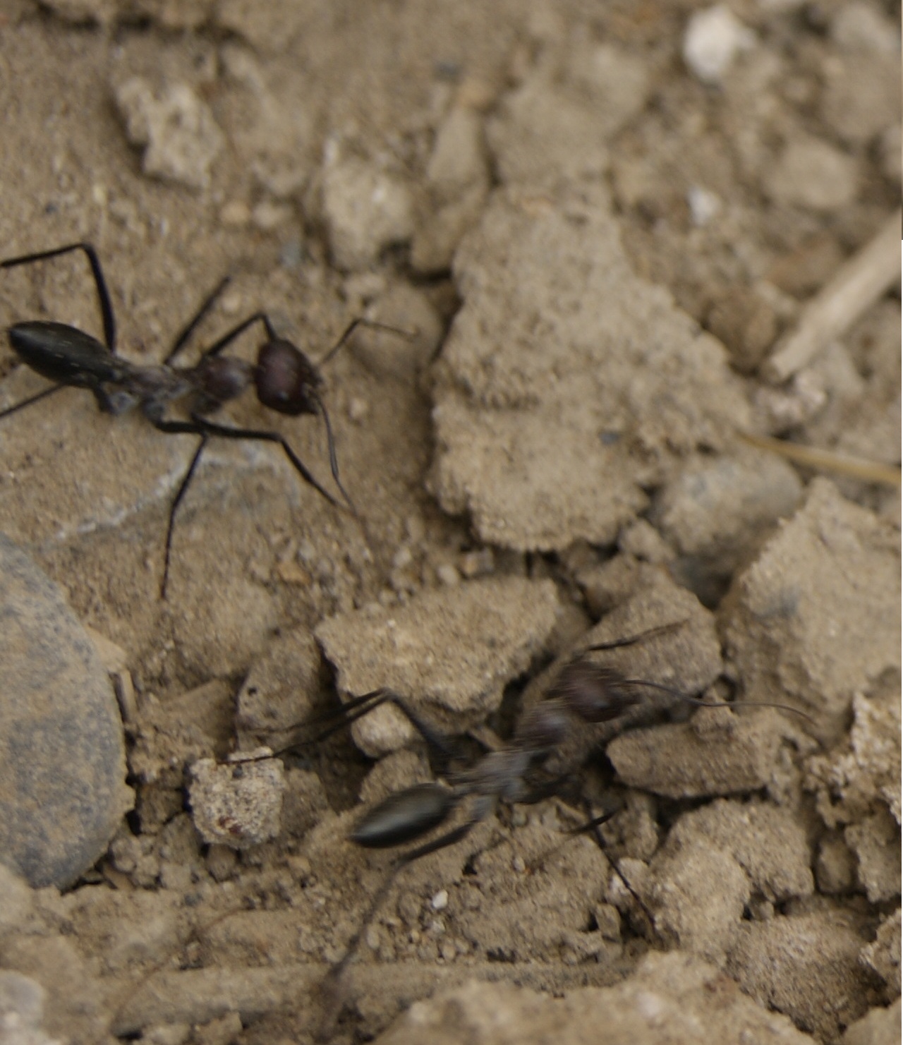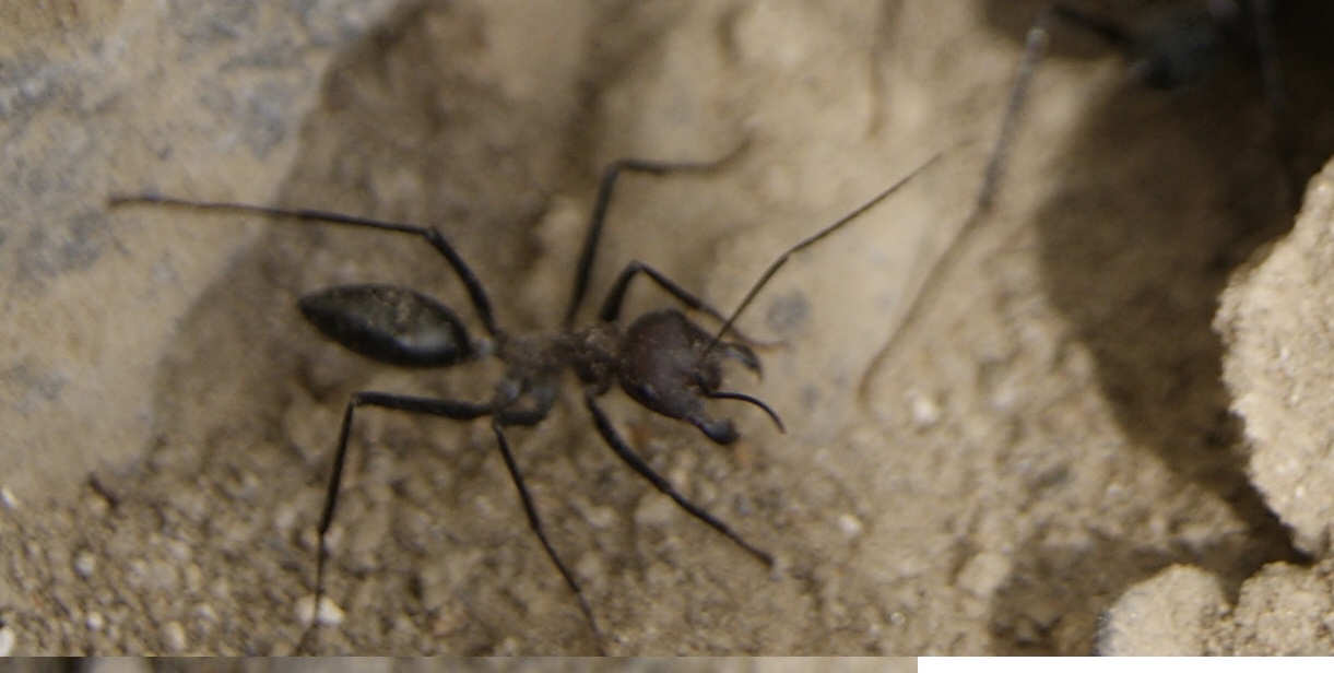 Die Ameise mit der hochgestreckten Gaster, eine hübsche Cataglyphis. Die restlichen Arbeiterinnen gehören zu Messor, bei den Alaten bin ich mir nicht sicher, könnte auch Messor sein.