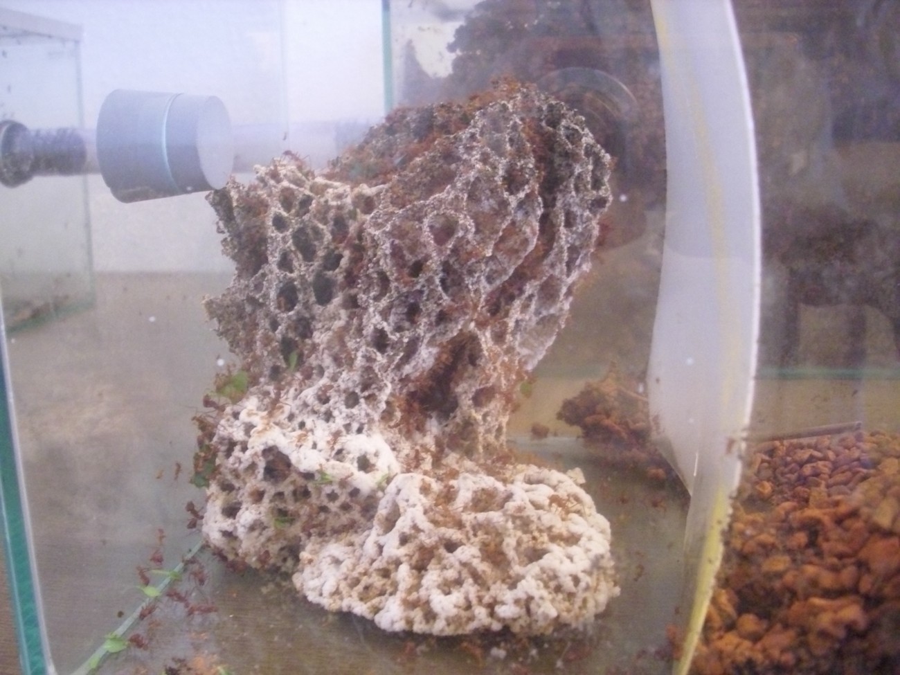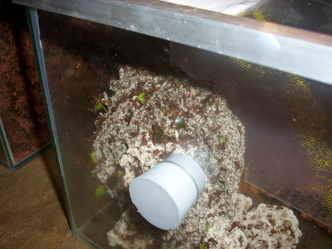 Wie ihr auf den folgenden Bildern sehen könnt entwickelt sich der Pilz prächtig in dem neuen Becken. Die Kolonie ist wohl jetzt zahlreich genug um so ein Territorium stabil zu halten, obwohl ich nicht die Gitter abgeklebt habe, um die Luftfeuchtigkeit stabil zu halten :).