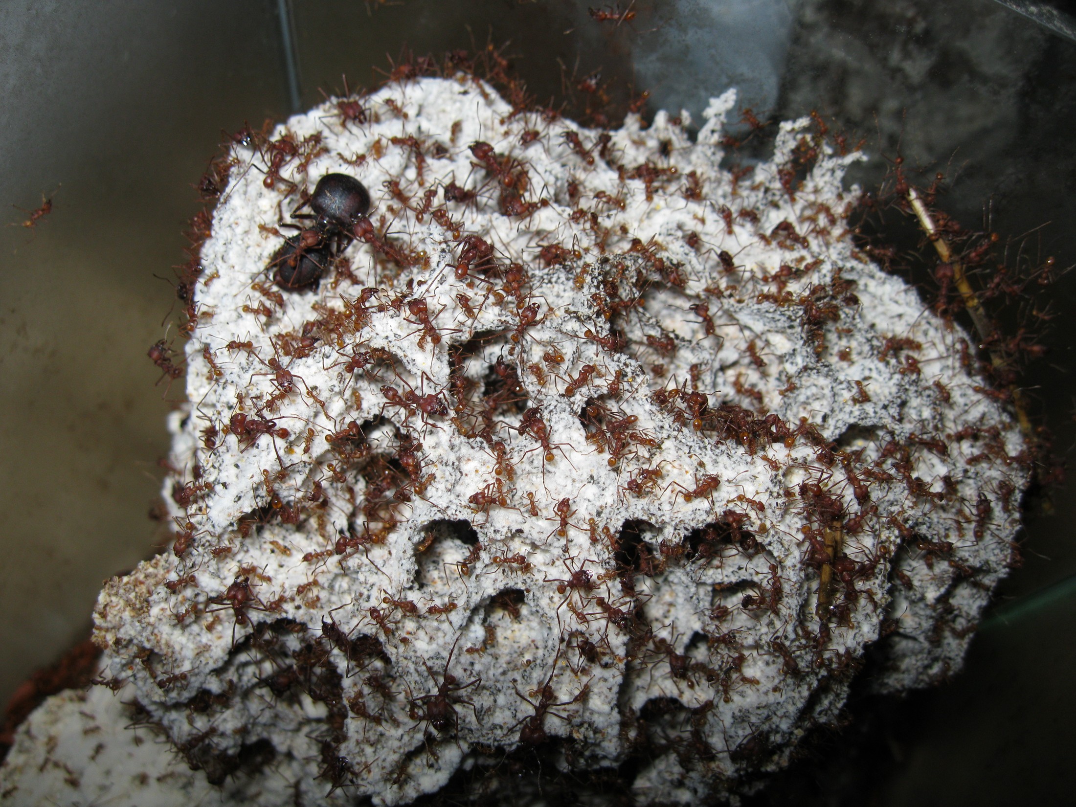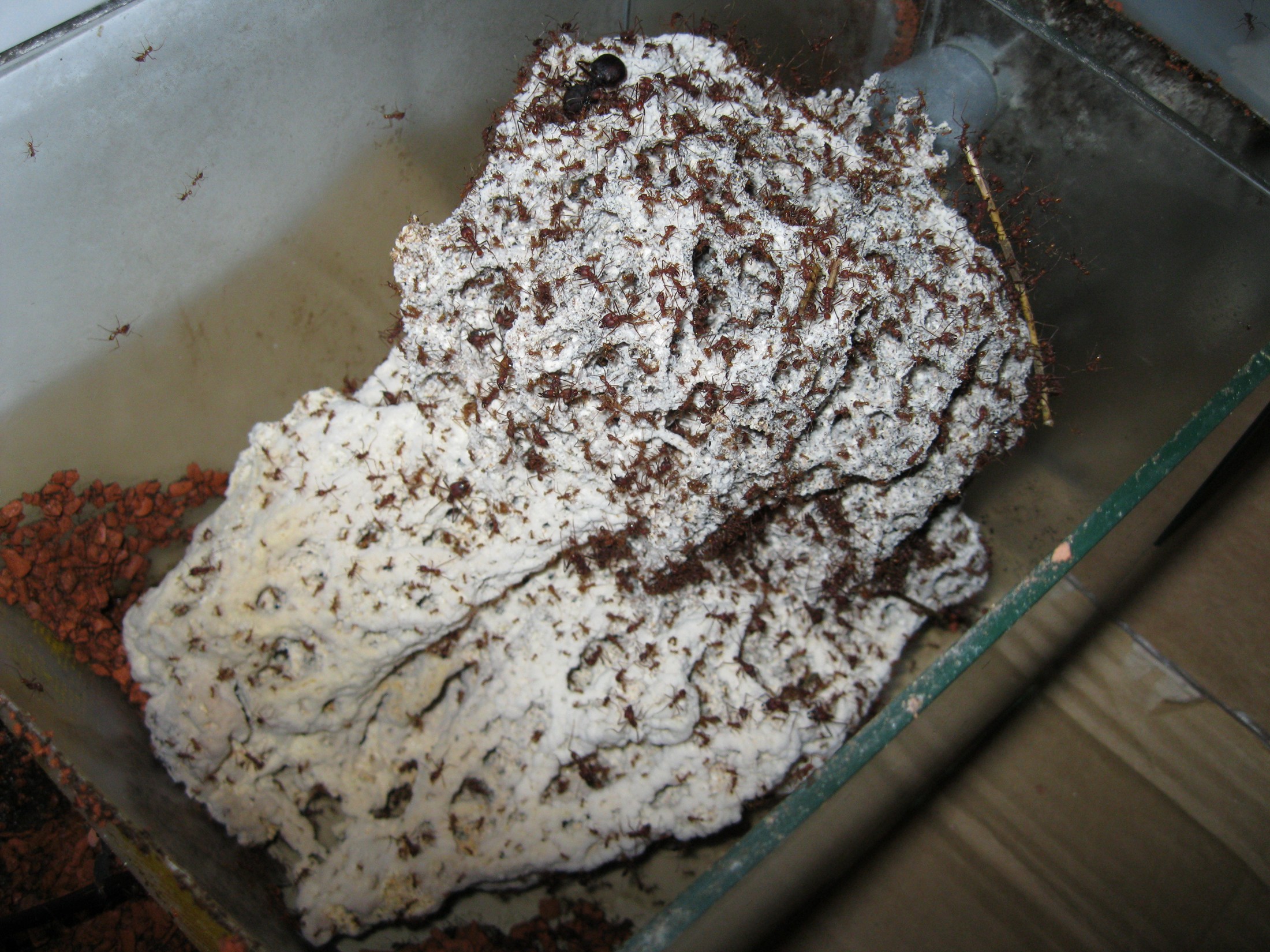 Ja! es ist mal wieder eine kleine Zeit ins Land gestrichen. Alles läuft gut und sie bauen fleißig. Ich kann oft beobachten wie die Königin sich von einen Pilzteil zum andere läuft. Ich habe jetzt auch schon etwas größere Arbeiter, die aber im Verhältnis zum Endstadium noch klein sind. Nun aber noch ein paar Bilder.