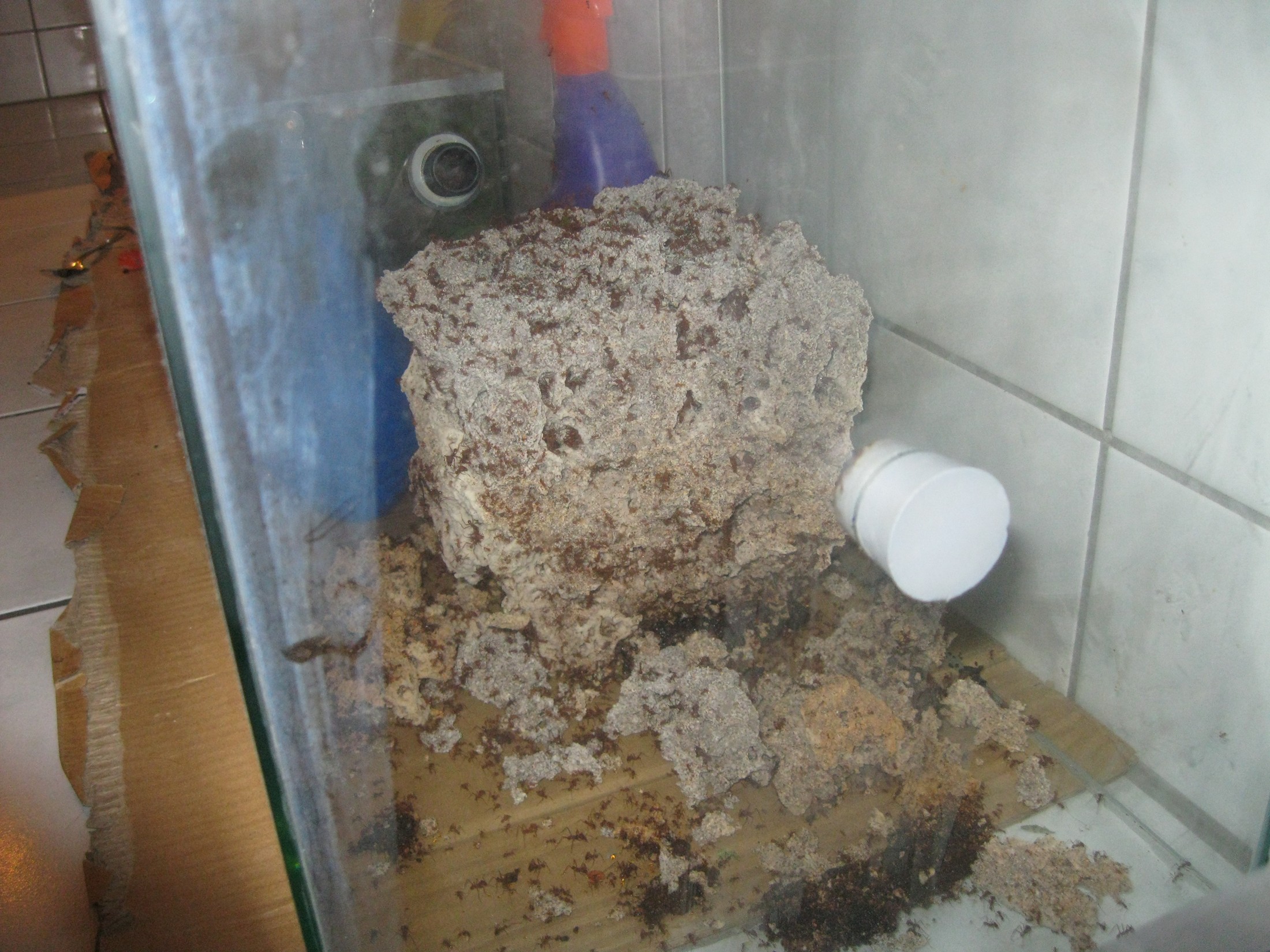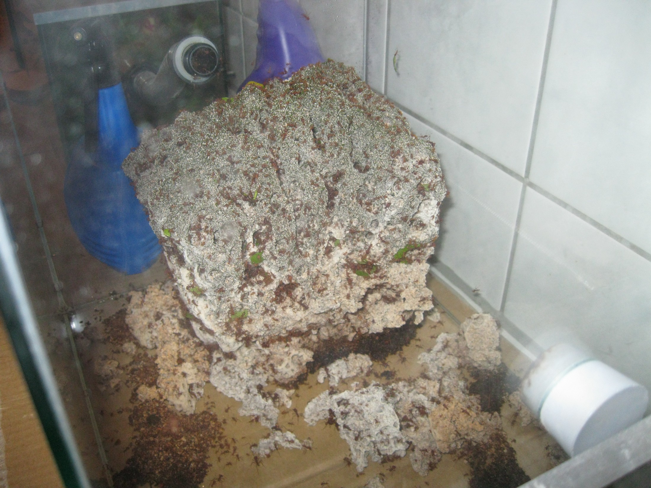 Meine Atta Kolonie entwickelt sich prächtig. Mittlerweile komm schon einige große Majore zum vorschein. Die Königin sehe ich jetzt garnicht mehr, aber vielleicht bewegt sie mal wieder ihre giga schlanken Hüften :). Ja sonst gibt es nichts neues so, nur das ich denke, das es jetzt schnell voran gehen wird, denn jetzt gibt es viele frische Blätter und meine Attas stürzen sich schon wie eine horde Halbaffen drauf :). Die Trennwand werde ich jetzt bald wegnehmen können. Ich warte nur noch darauf, das der Pilz unten Eben wird.