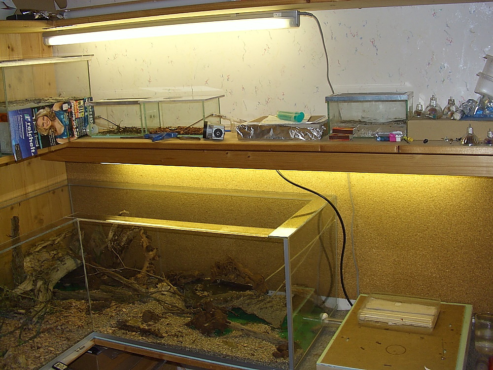 meine ameisen habe ich von hier aus relativ gut im blick^^ ich sehe meine Messor barbarus und meine Formica fusca, sowie die Lasius niger, sie alle stehen auf einem regal neben meinem bett, die lampe hängt von einem regal runter und als nachbarn haben sie gelbe fauchschaben^^