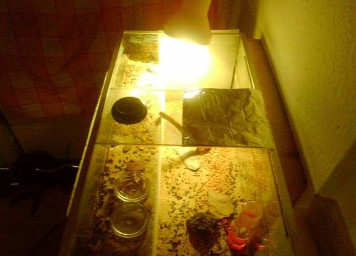 Das Ganze wird durch eine 60W Spotlampe beheitzt (die Lampe steht jetzt auch etwas höher über dem Becken als auf dem Bild) und nachts sollen zwei Heizmatten für die nötige Temperatur sorgen.Diese sind jeweils links und rechts außen am Becken befestigt. Im Becken selbst herrschen tagsüber 27C°- 28C° und nachts 20C°- 21C°. Tagsüber sind es ca. 40% Luffeuchtigkeit und nachts dann bis zu 60%. Wasser und Nahrung gibt es immer. Es gibt eine Tränke und eine Schale mit Wasser, auch trinken die Ameisen das Kondenswasser von den Scheiben.
