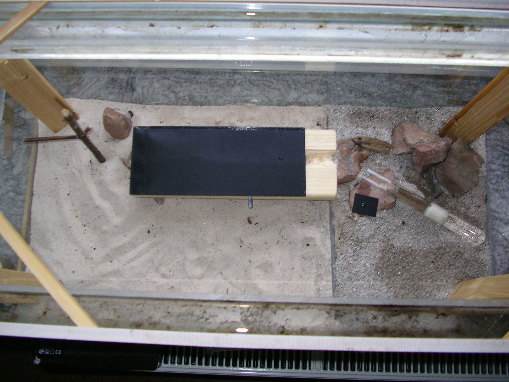 Ausbruchschutz: Wassergraben am oberen Beckenrand und zusätzlich ein Fliegengitter-Deckel mit Klettverschluss, falls doch mal der Wassergraben austrocknet. Wassertank: Reagenzglas mit Watte.