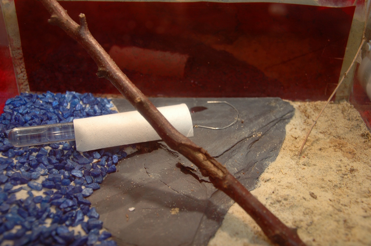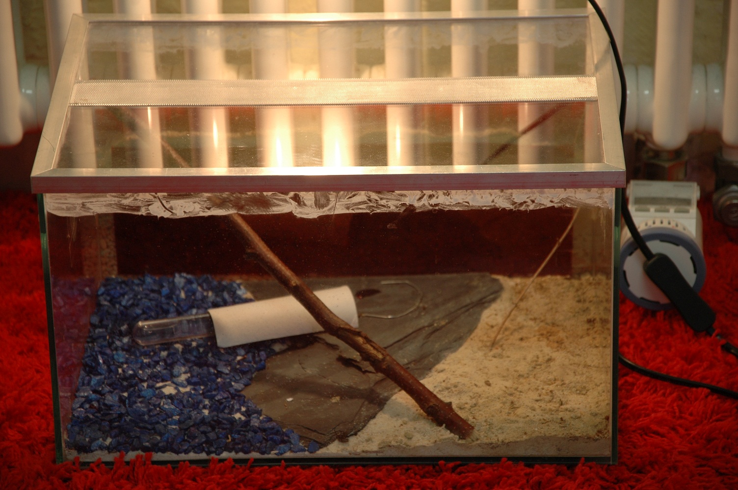 Ich werde in den nächsten Stunden ein sehr schlichtes und einfaches Nest für die Tiere bauen, das ausschließlich aus einer einfachen Plastikbox (etwa 15x10x10cm), also Arenabereich und einem Reagenzglas als Nest bestehen soll, damit ich möglichst gute Möglichkeiten habe, die Tiere zu beobachten, und sie zu pflegen.