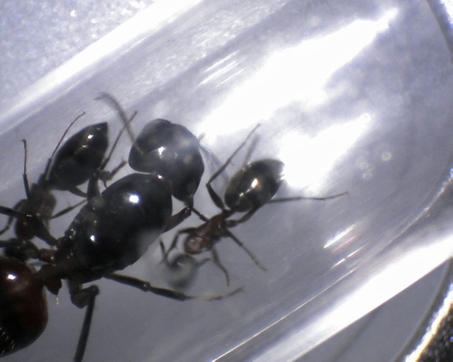 Die habe ich sozusagen als meine Kanarienvögel da hineingestellt, einerseits will ich den Camponotus noch etwas Winterruhe gönnen, andererseits teste ich mit für mich leichter zu beschaffenden Ameisen aus, ob keine Giftigen Stoffe in der Arena vorhanden sind, dem ist scheinbar nicht so.