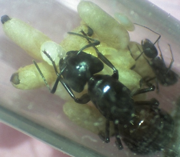 Gerade konnte ich sehen, dass sie wieder Eier gelegt haben, elf oder zwölf dürften es sein - interessante Randbemerkung: bei kleineren Arten wie Lasius niger könnte ich die Eizahl nicht so leicht zählen, zumal die diese direkt zusammenkleben...