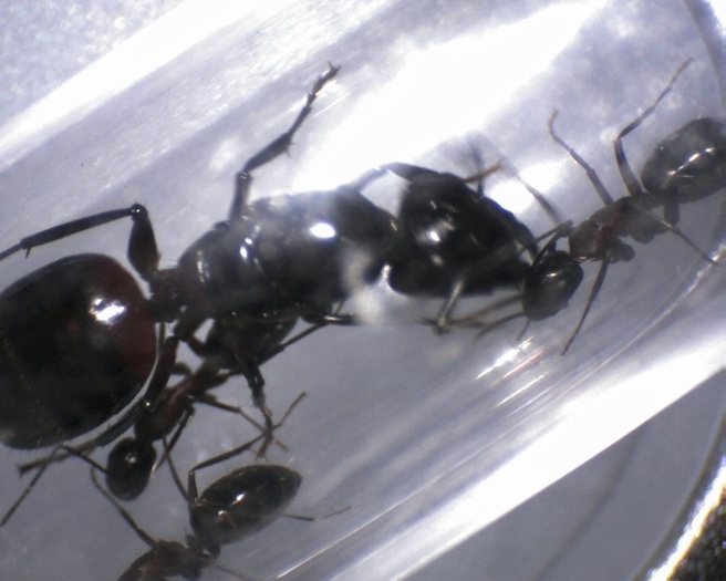 Die habe ich sozusagen als meine Kanarienvögel da hineingestellt, einerseits will ich den Camponotus noch etwas Winterruhe gönnen, andererseits teste ich mit für mich leichter zu beschaffenden Ameisen aus, ob keine Giftigen Stoffe in der Arena vorhanden sind, dem ist scheinbar nicht so.