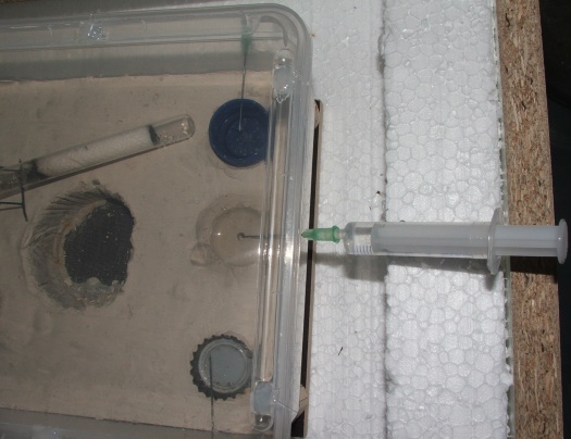 Ach ja, über die Kanülen kann man kinderleicht Zuckerwasser zuführen (später, wenn die Arene deutlich gut befouragiert wird und auch gut den Gipsboden von außen befeuchten!