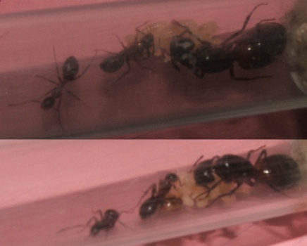 Dies konnte ich auch beobachten, eine Arbeiterin gab an eine andere Kropfflüssigkeit ab, der Gaster von Letzterer wurde immer größer, Erstere immer dünner und schließlich gab diese Arbeiterin ihren Kropfinhalt an die Königin weiter, ein bisschen so, als ob man Öl mit einem kleinen Tank auffängt, es in einen anderen füllt und diesen dann in einen Traktor entlehrt...