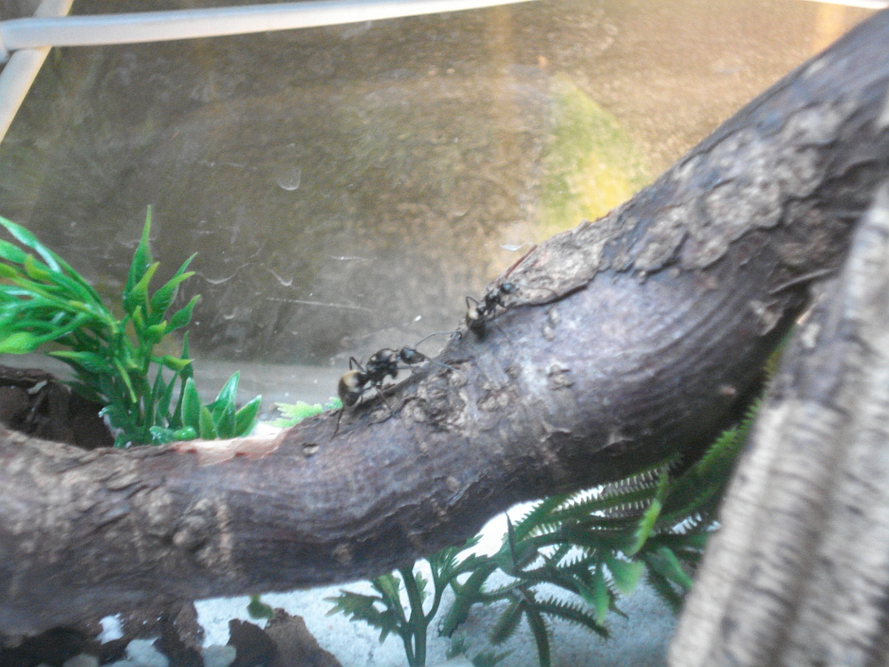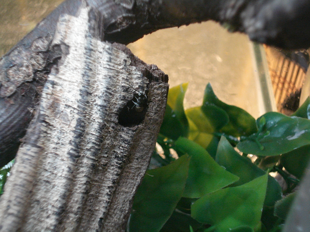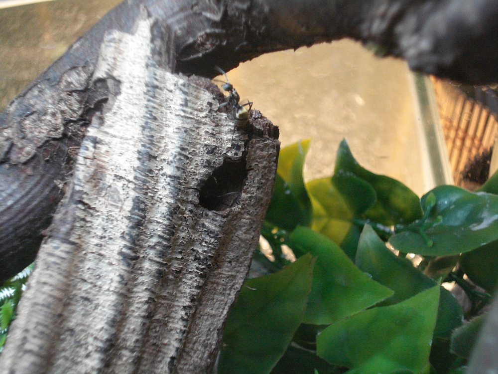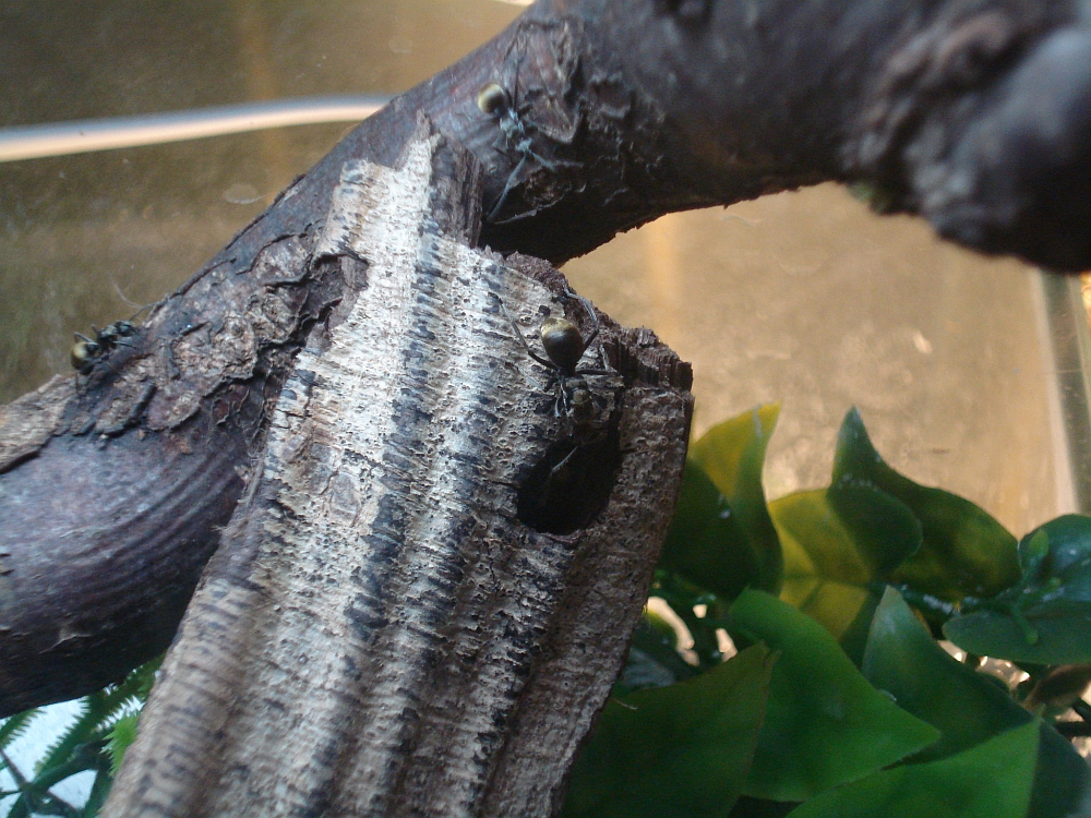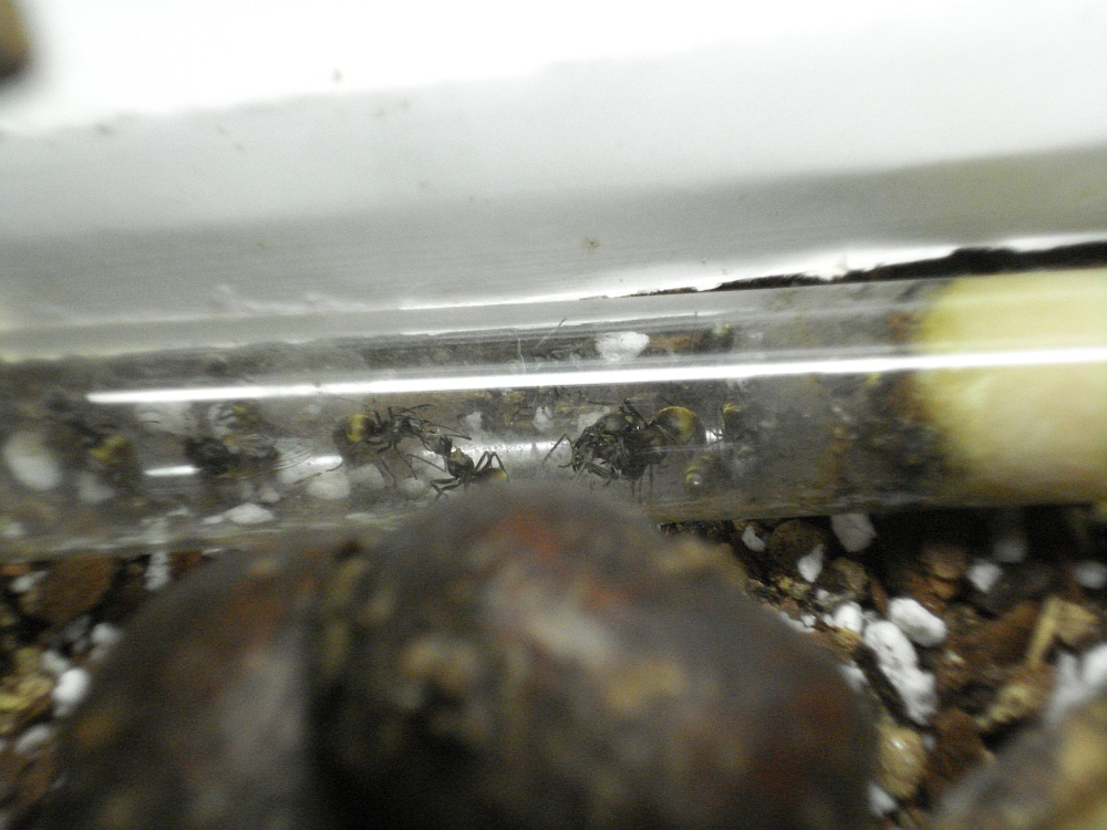 Die Entwiklung ist zwar schleppend, aber dafür werden es ständig mehr goldene Punkte im Terrarium. Mittlerweile haben die kleinen Racker auch ein grösseres Becken erhalten. Schön eingerichtet mit Holz, Erde und einiges an Versteckmöglichkeiten. Als sie im Neuen "Gehege" eingesetzt waren wurde dieses auch gleich begutachtet und die frohe Botschaft zurück ins Reagenz getragen. Schon kam es zu einer Ketenreaktion. Alle, aber auch wirklich alle stürmten aus dem verschmutzten Glas und emsig wurde ein passendes Schlupfloch gesucht. Schnell war dieses gefunden. ca 15 Minuten später machten sich schliesslich alle auf Wanderschaft. Erst jede einzelne Arbeiterinn.