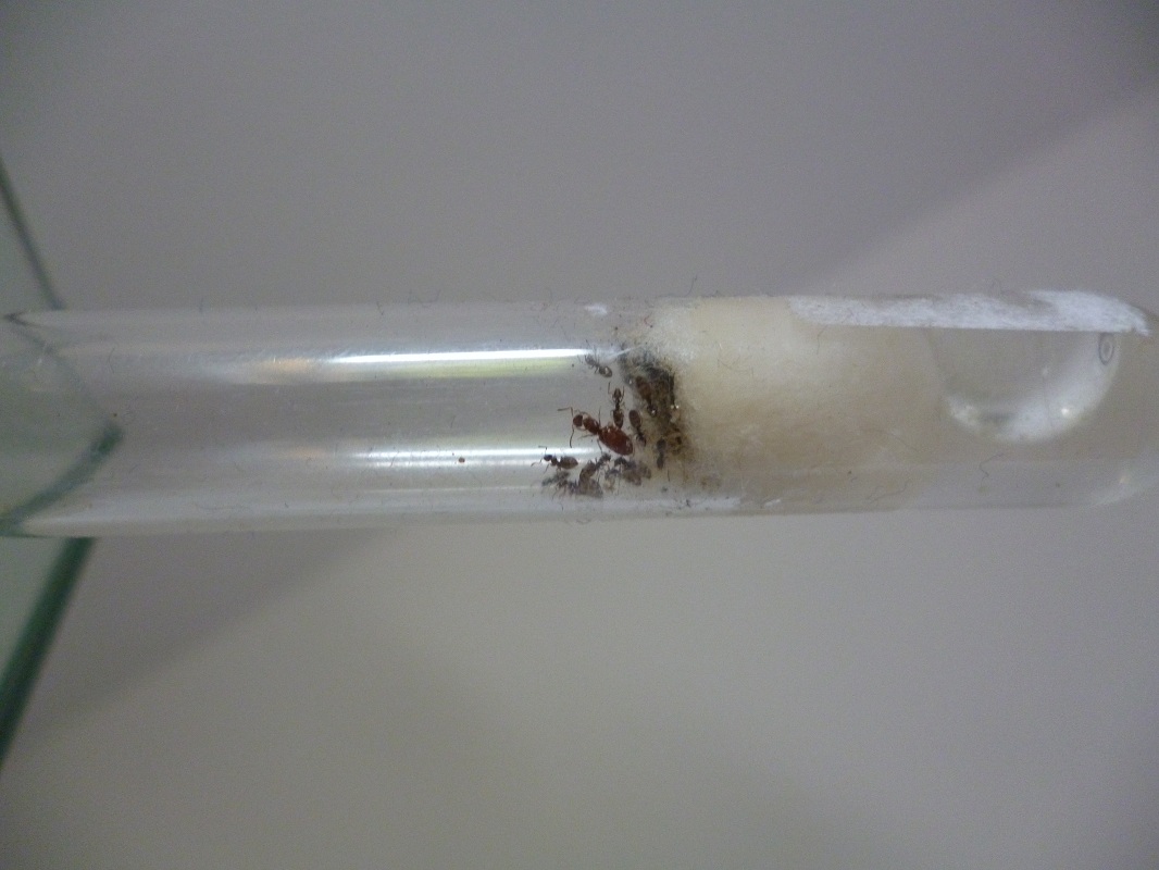 Sie sind kleiner als ich erwartet habe, aber sehr viel interessanter. Die Gyne hat eine schöne rote Färbung und genau das gefällt mir. Etwa 15-20 Arbeiterinnen sind mit geliefert worden. Ein paar kleine Larven konnte ich auch schon sehen. Ich habe schon einmal Solenopsis fugax gehalten. Beide Arten zählen mit zu den kleinsten Ameisen. Ich kann empfehlen lieber die Plagiolepis pygmaea zu nehmen als die Solenopsis fugax. Die Solenopsis sind sehr viel langsamer. Die Gyne vielleicht größer jedoch finde ich sind sie langweiliger. Diese Ameisen sind recht flink und aktiv. Sehr schön zu sehen ist, dass sie große Mengen an Futter im Hinterleib speichern. Erinnert mich ein wenig an Honigtopfameisen. Viel fressen tun sie nicht, liegt aber wahrscheinlich daran, dass sie noch viele Voräte haben. Noch graben sie nicht, hoffe jedoch, dass sich das bald ändert.