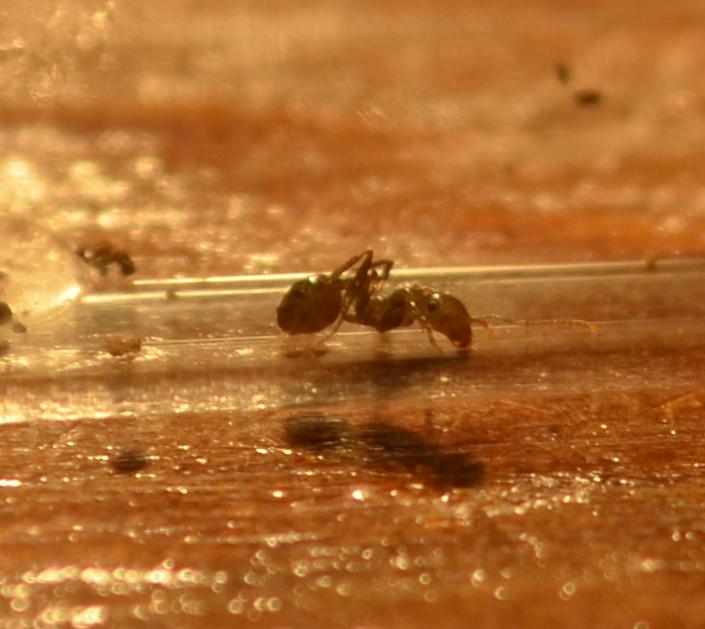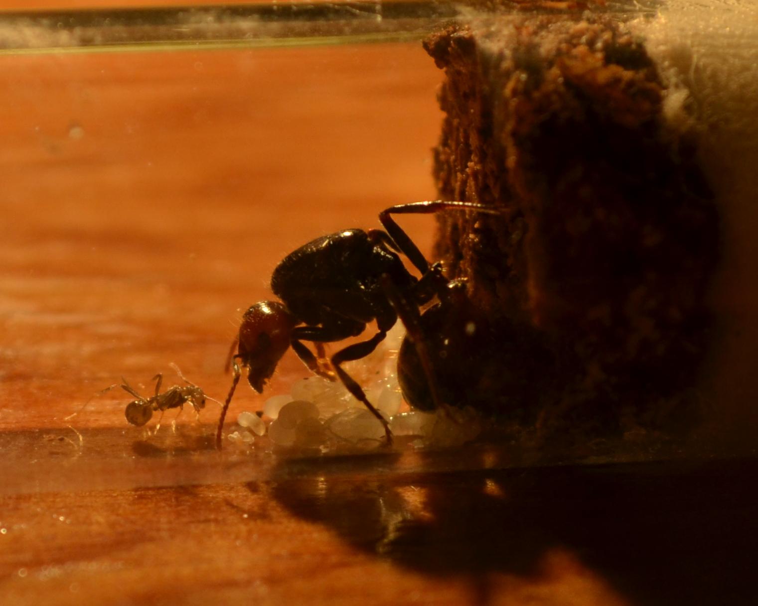 Here is the queen lapping up some milk+honey solution. This solution has proven to be extremely beneficial for almost every species of ant that I keep. One can see 5 eggs near her abdomen.