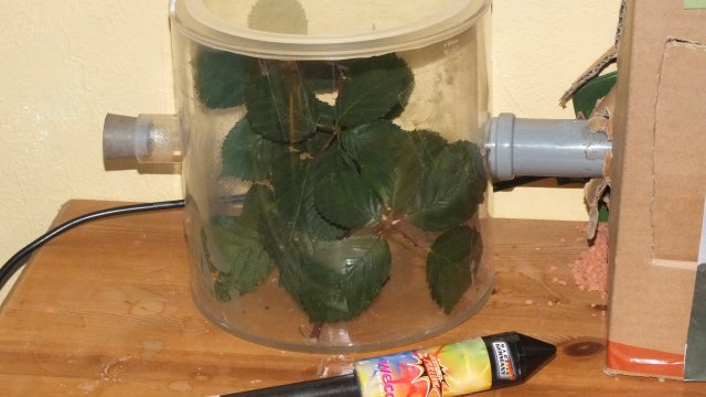 Da ich immer wieder Probleme mit dem vielen Kondenswasser hatte,habe ich nun Löcher in den Boden gebohrt und das Becken schräg gestellt, damit das Wasser abfließen kann. Außerdem habe ich noch weitere größere Löcher unten gebohrt, damit auch schwerere Gase dort austreten können. Oben habe ich auch noch ein Loch gebohrt , damit dort leichtere Gase ein- austreten können.