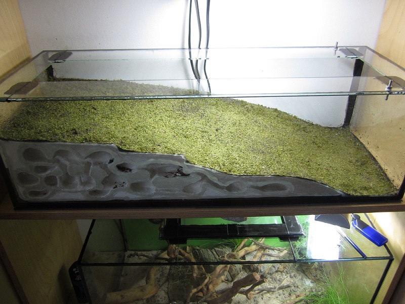 Duch Zufall hab ich ne Camponotus spec. Gyne gefunden, die im RG auch gleich mit dem Eierlegen angefangen hat. Für die hab ich dann auch ein Formicarium gebastelt, das sich bis nächstes Jahr "verwachsen" darf. Die Oberfläche wird flächendeckend Moos mit Laub, Ästen, Steinen usw. Also heimischer halbschattiger Waldboden in etwa...immer leicht feucht (bei Bedarf nur oberflächlich) bei 25-30 °C. Nest Ytong/Gips.