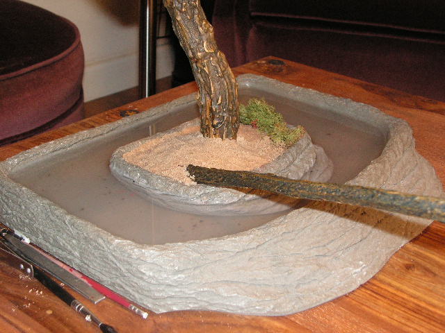 I found several dry branches and bits of dry bark but nothing i could use .But then i spotted some realisting looking branches that have wire inside so there bendible . I bought several diffrent sizes so i could make a tree with brances i could bend to my liking . I thn found some reptile water bowls that looked like rock so bought a large and small size one .As a resuilt my tree had a base and now a island so no escape could happen .