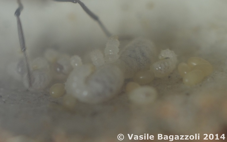 About a week ago the worker passed away unexpectedly. The queen is now all on her own. Luckily, she is a very good mother. She tends to the larvae, feeds them, forages for food, cleans them and the brood chamber, etc. Soon enough these larvae will pupate and she will have a work force again! Here are some photos of the queen dragging a large, preboiled half-cricket into the brood chamber. More photos on my facebook page.