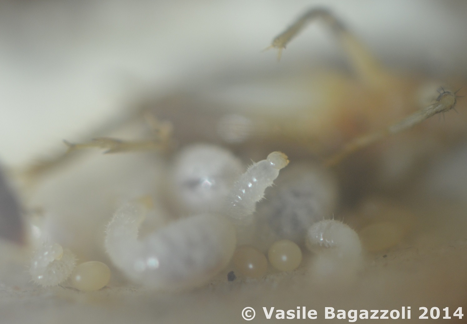 The larvae must sense through their hairs somehow, I'm not sure exactly. They immediately begin to arch their necks to access the food as soon as prey is dragged into the founding chamber near them.