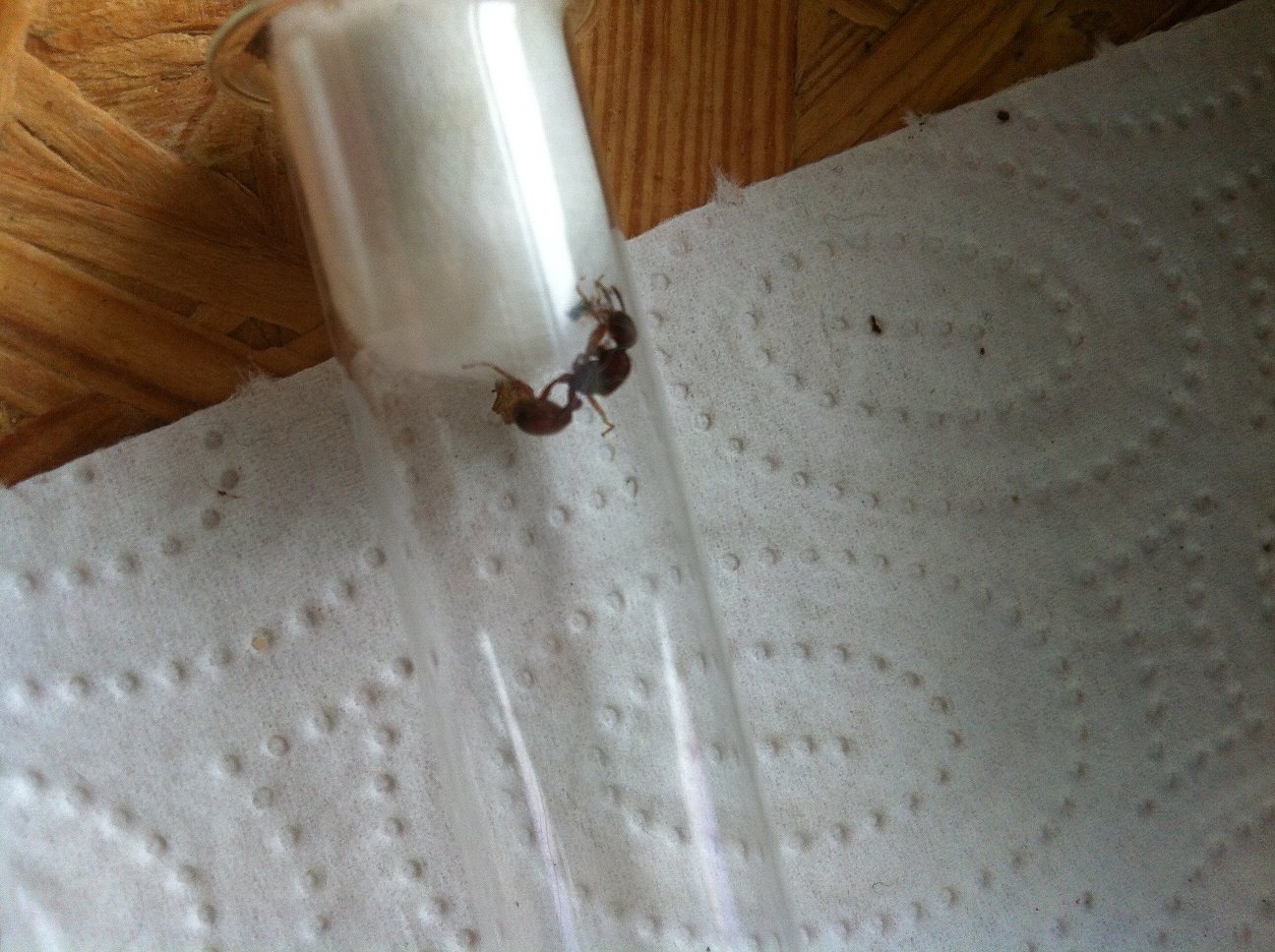 Dunkelrote Färbung, gute 13mm groß und ziemlich aggressiv. Definitiv eine Knotenameise.