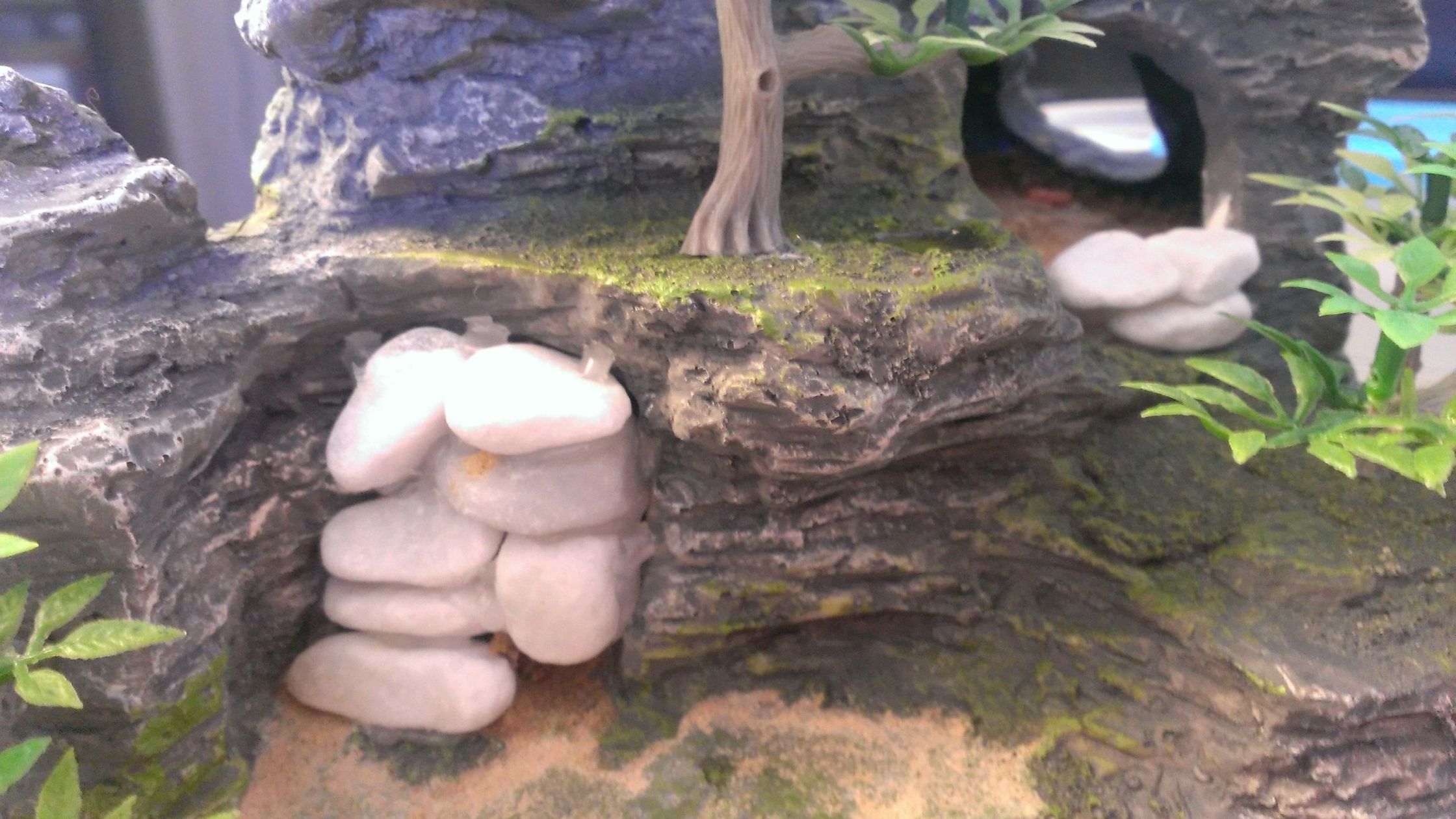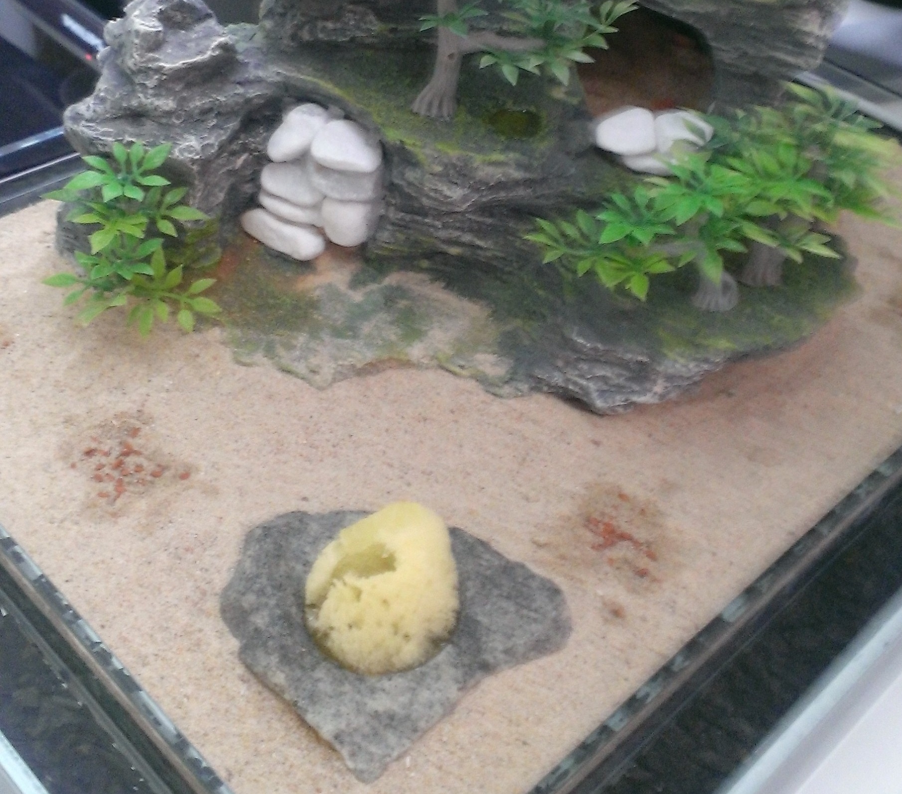 In die freie Ecke kam nun noch ein kleiner Felsen mit Vertiefung in dem nun ein Naturschwamm steckt welcher mit Zuckerwasser getränkt ist.