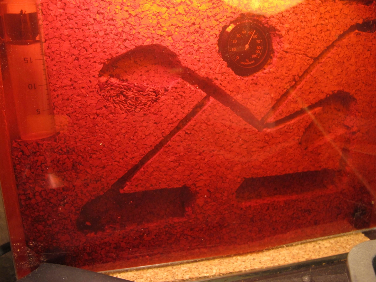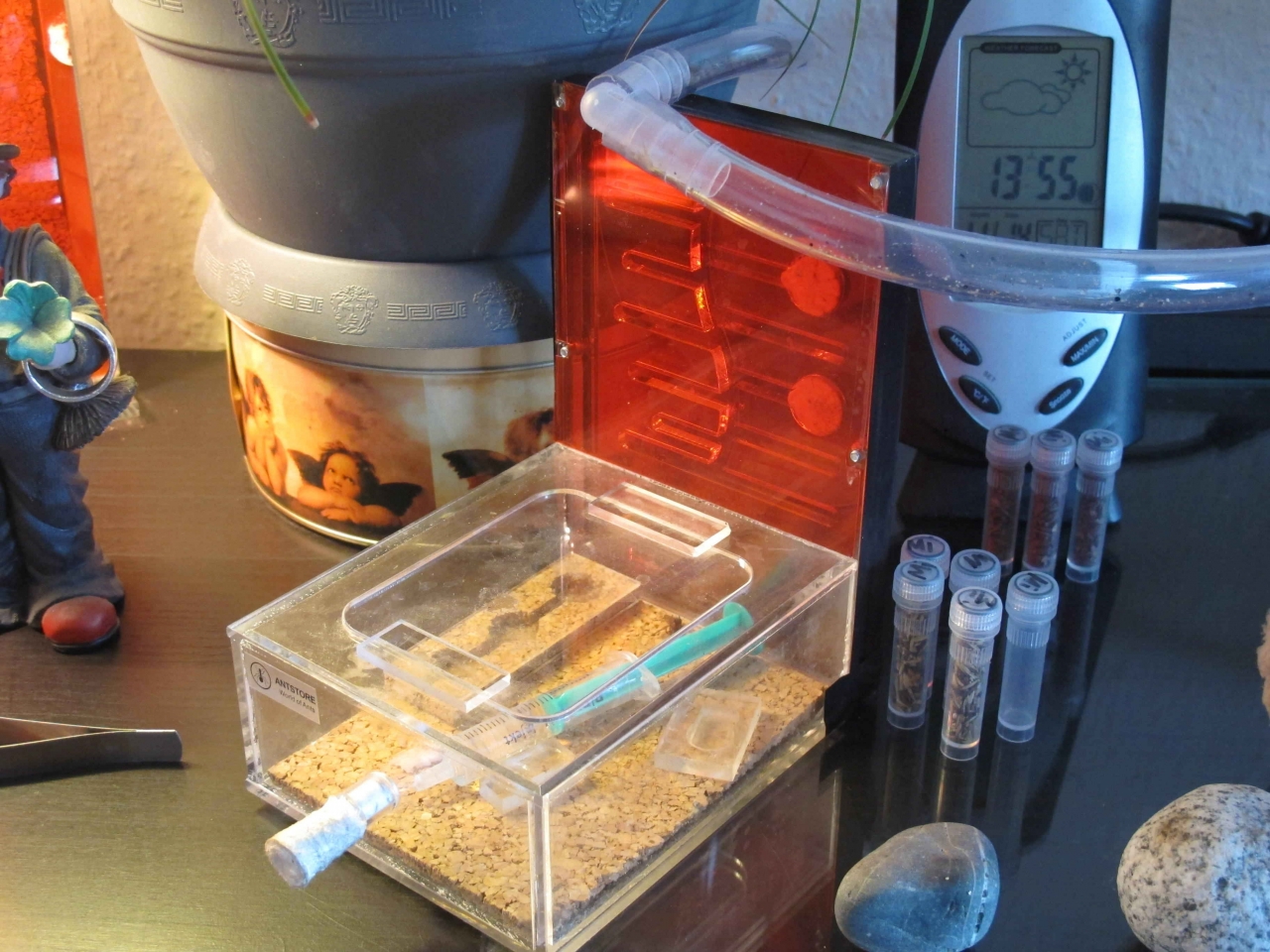und auf denn zwei letzten Bilder erkennt man, dass die Eierkammer mit der Königin recht feucht ist. Habe das Nest so gebaut das ich es jederzeit von links problemlos befeuchten kann ohne die Kolonie zu stören.
