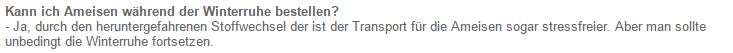 Ob es die Ameisen in der Winterruhe mehr stresst, wenn sie verschickt werden, als während der Saison kann ich dir nicht beantworten. Allerdings gibt es einen kleineren Temperaturbereich der ideal wäre, als in den restlichen Monaten. Da sie in der Winterruhe sind, sollte die Temperatur einstellig sein, aber eben nicht gefrieren.