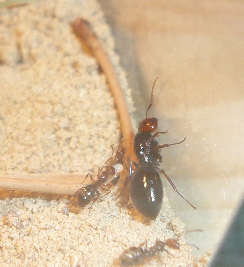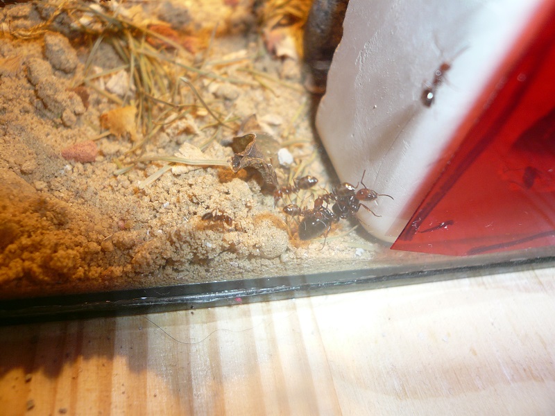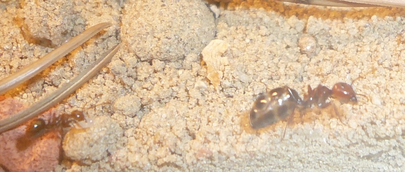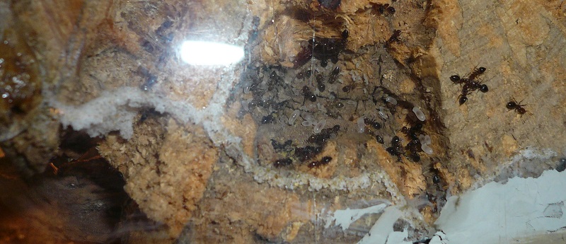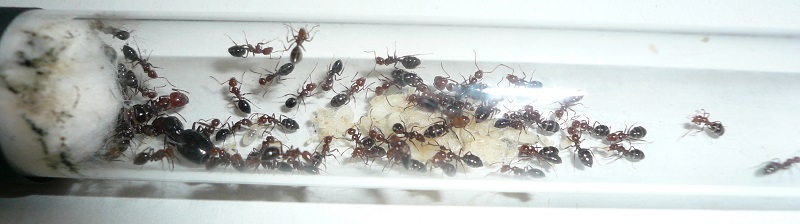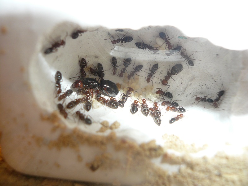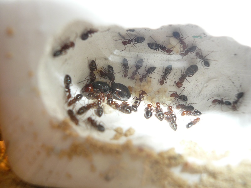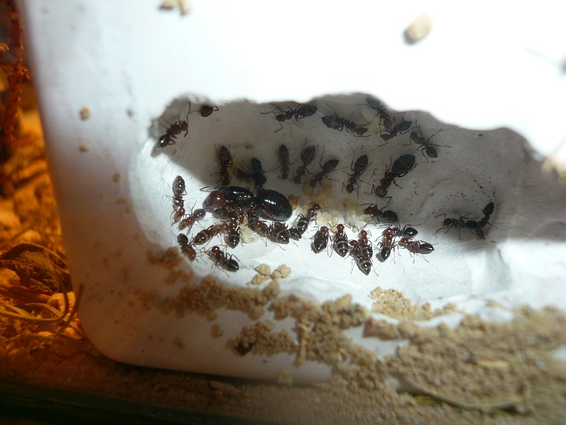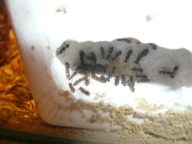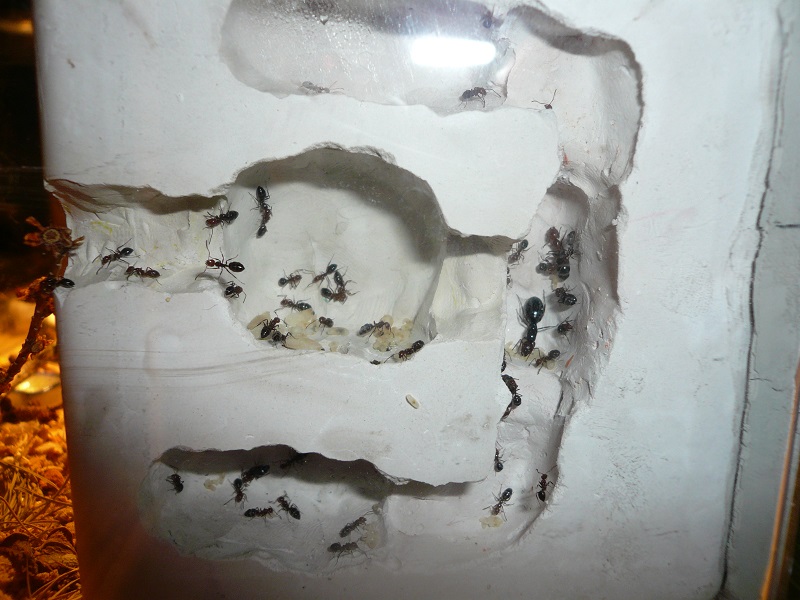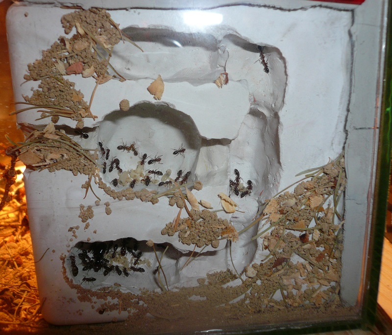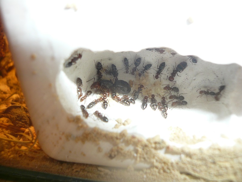 Ich hab sie natürlich gleich ins Formi gelegt und ihnen Honigwasser und eine Mücke angeboten. Nachdem die etwa 60 Arbeiterinnen ihre Scheu überwunden hatten, haben sie gleich ihre 30x20x20 Arena erkundet und haben dabei auch das selbstgebastelte interne Gipsnest gefunden und erkundet. Und während das Honigwasser dankend abgelehnt (sie hatten wohl keinen Durst, jede zweite war physiogastrisch) und die Mücke von einem Ende der Arena zu anderen gezerrt wurde, bildete sich eine immer belaufener werdende Ameisenstraße ins Nest, bis schließlich auch die zahlreiche Brut, die beiden Majore, die wohl als Repleten dienen (beide waren randvoll mit Honigwasser), und auch die Königin umzogen.