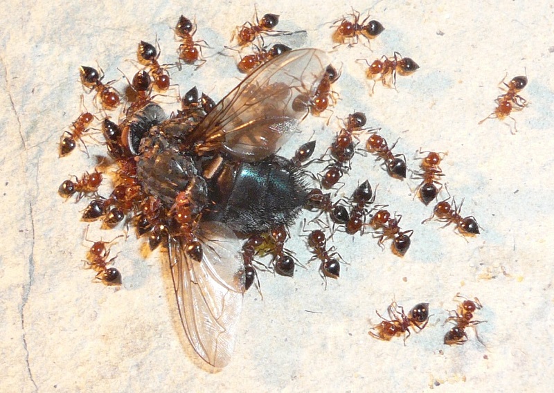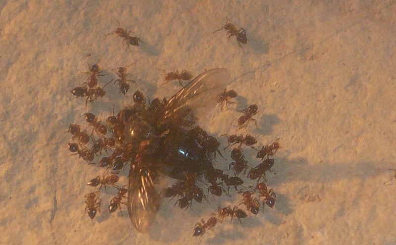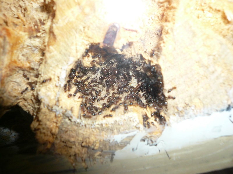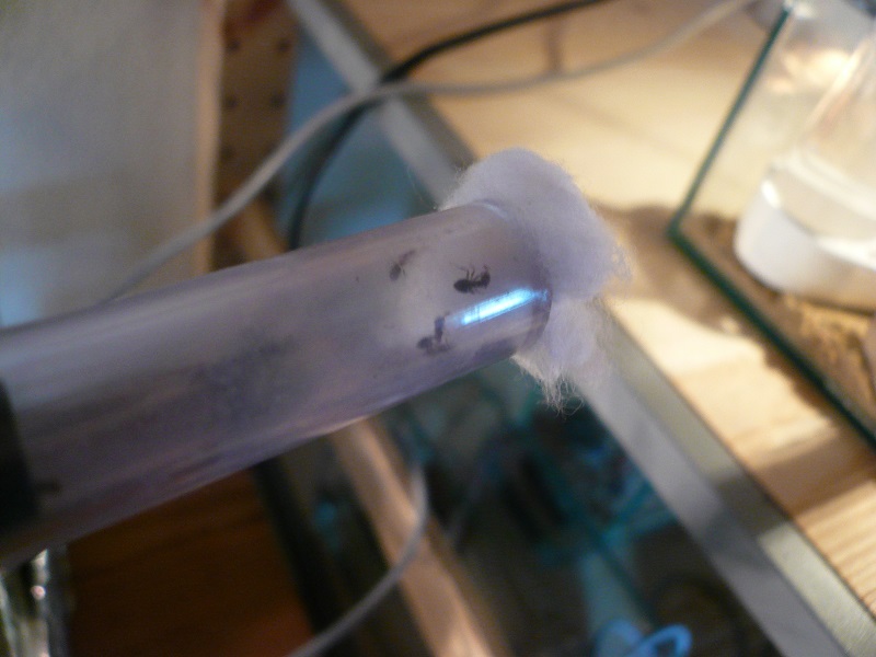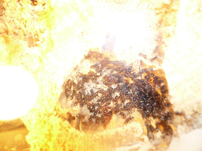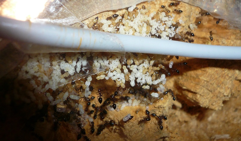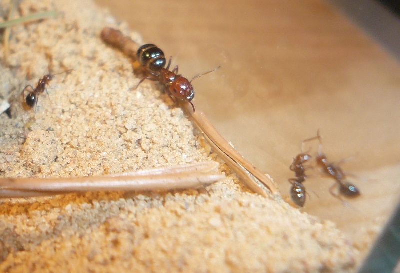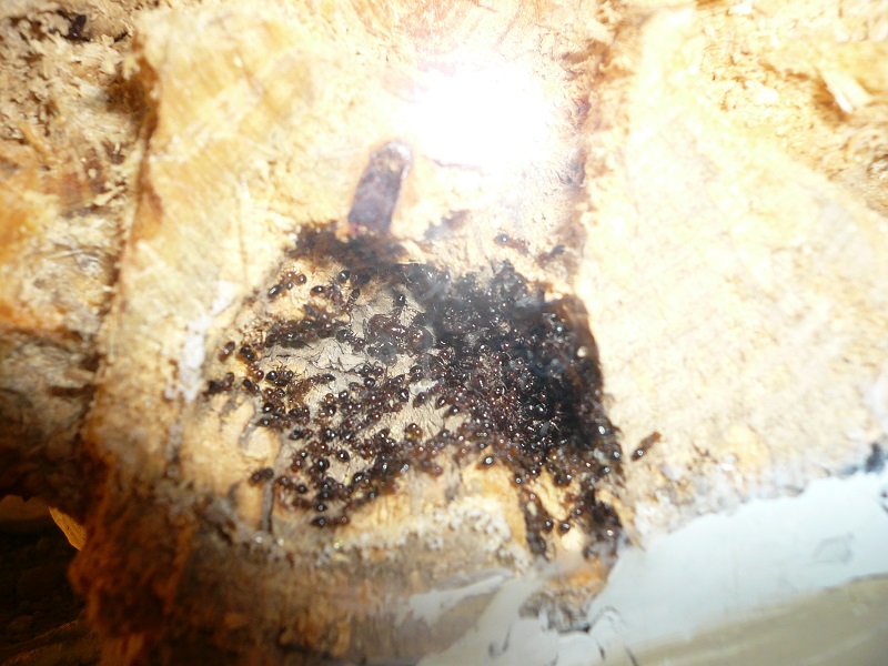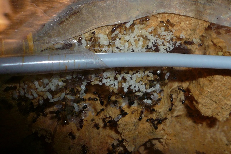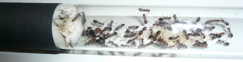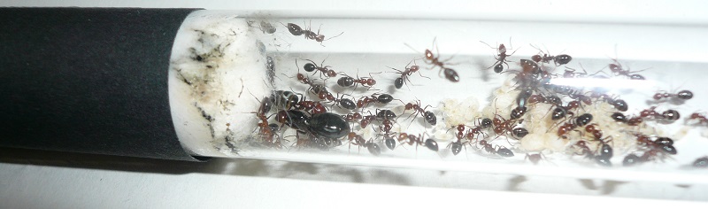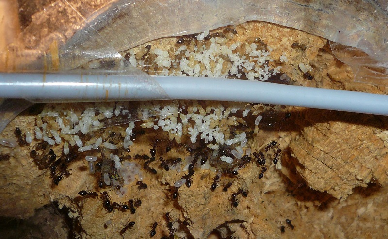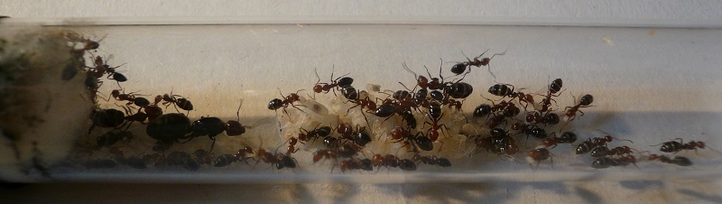 Ich hab sie natürlich gleich ins Formi gelegt und ihnen Honigwasser und eine Mücke angeboten. Nachdem die etwa 60 Arbeiterinnen ihre Scheu überwunden hatten, haben sie gleich ihre 30x20x20 Arena erkundet und haben dabei auch das selbstgebastelte interne Gipsnest gefunden und erkundet. Und während das Honigwasser dankend abgelehnt (sie hatten wohl keinen Durst, jede zweite war physiogastrisch) und die Mücke von einem Ende der Arena zu anderen gezerrt wurde, bildete sich eine immer belaufener werdende Ameisenstraße ins Nest, bis schließlich auch die zahlreiche Brut, die beiden Majore, die wohl als Repleten dienen (beide waren randvoll mit Honigwasser), und auch die Königin umzogen.
