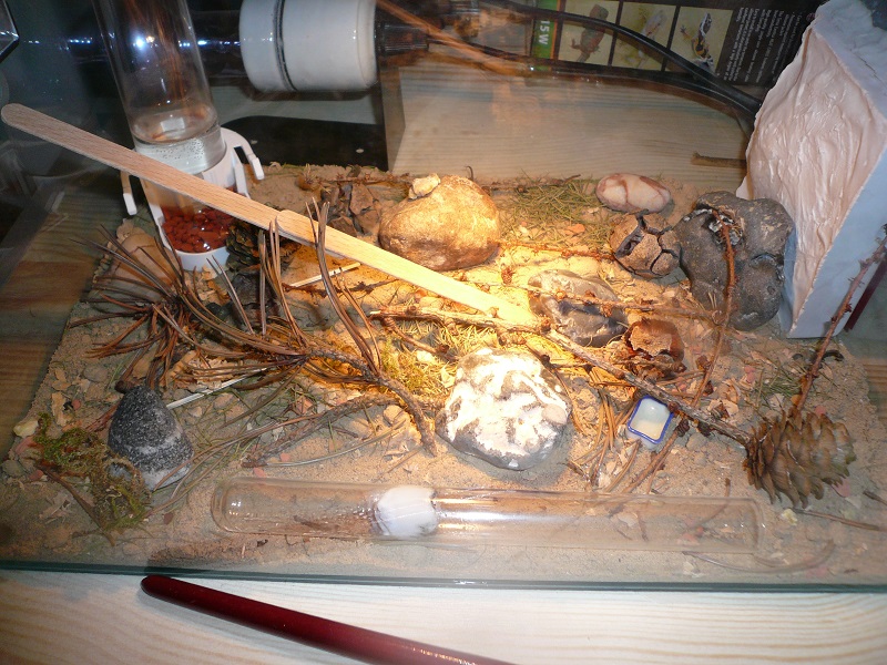 Zum Formi: Ich hab eine 30x20x20 Arena vom Antstore mit einem 35W-Halogenstrahler und einem selbstgebautem Gipsnest drin. Wie es eingerichtet ist, sieht man auf den Fotos.