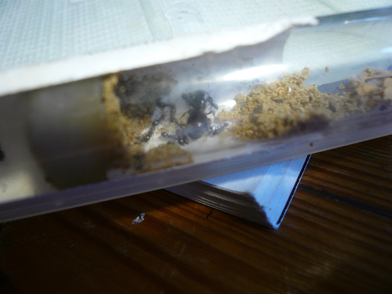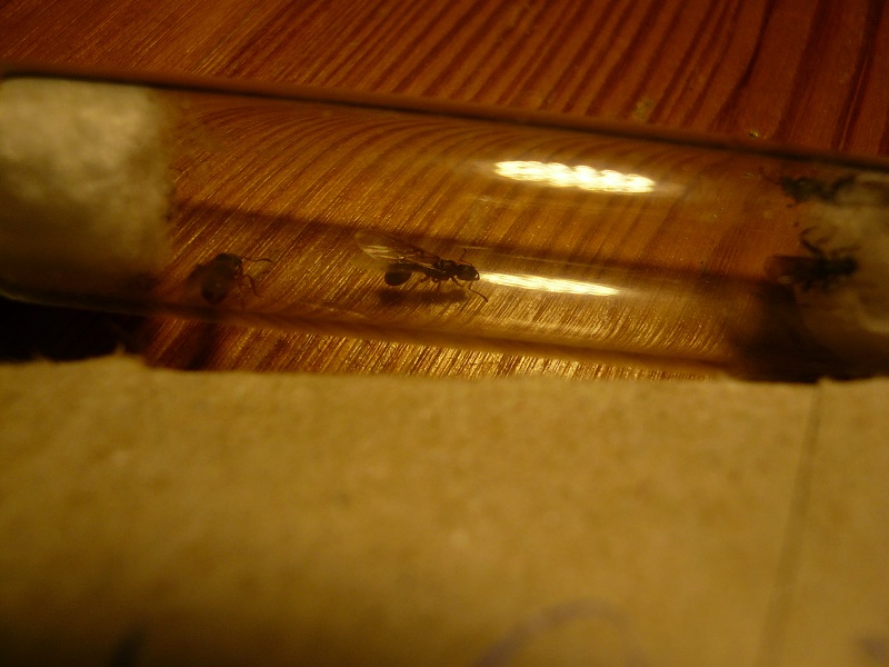 Montag war bei uns im Garten ein riesiger Schwarmflug. Ich hab gleich mal mehrere gerade paarend landenden Paare aufgesammelt und in eine Arena mit nur einem RG drin getan. Was ich vorhatte, hat auch geklappt: Jetzt hocken nur die Königinnen im RG, eine hat auch schon die Flügel abgestreift und sie verstehen sich. Aber was ist das für eine Art?