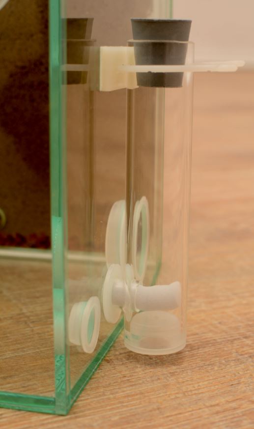 So kann man nun an die Bohrungen im Glas Futterröhrchen einstecken und vor allem finde ich den trinkbehälter sehr gelungen, dieser tropft durch einen eingearbeiteten Schwamm nicht.