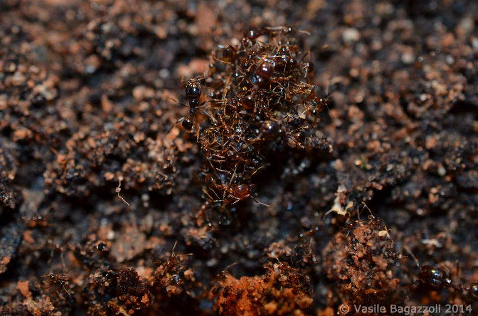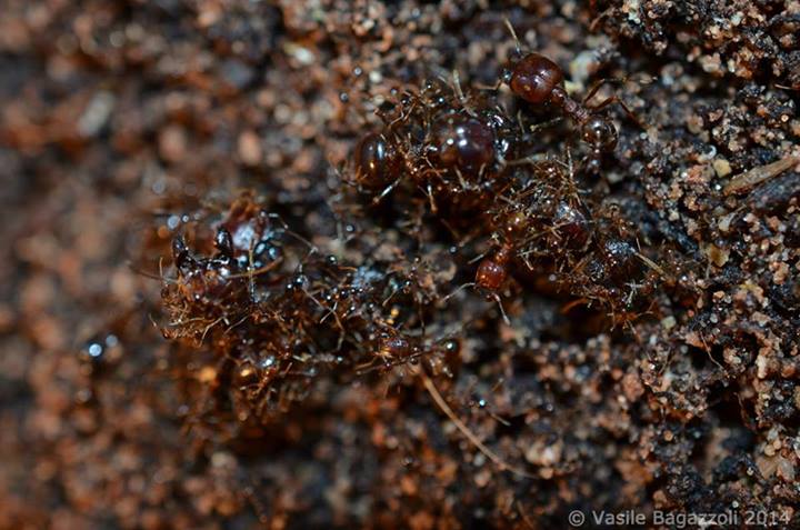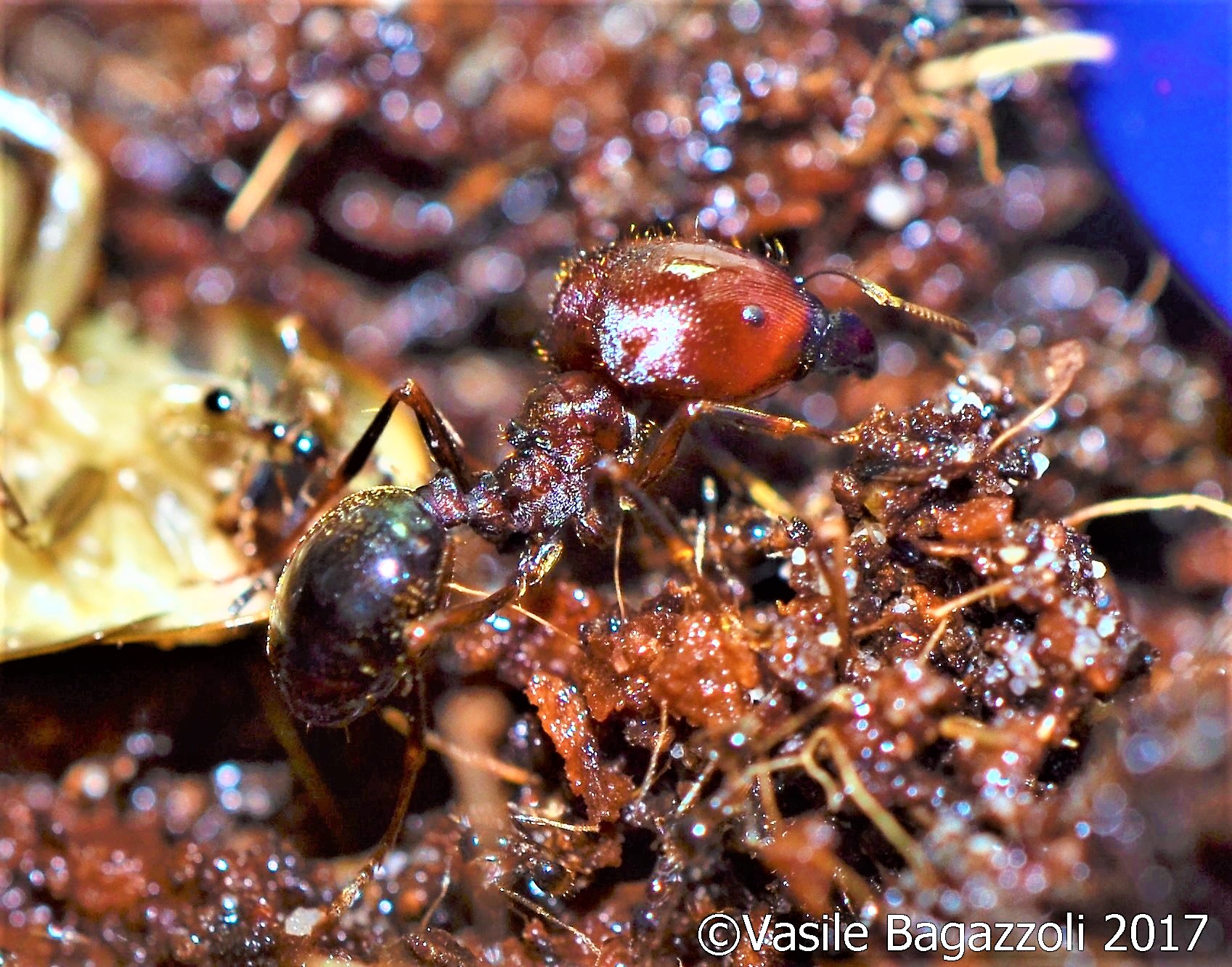 A large major within the nest along with her much smaller sisters. The smaller ants will ride atop the larger soldiers for protection and a free ride. The benefit to the larger soldiers is that the smaller workers groom and remove potential parasites as well as defend against divebombing flies intent on laying an egg inside the soldier's head.