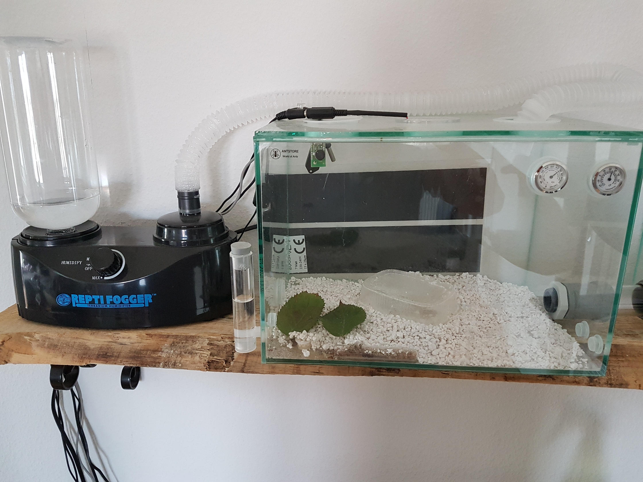 Diese gibt die Feuchtigkeit nach und nach wieder an die Luft ab und in Verbindung mit dem Glasdeckel mit der kleinen Belüftung ergibt sich dann die benötige Grundfeuchtigkeit in der Luft.