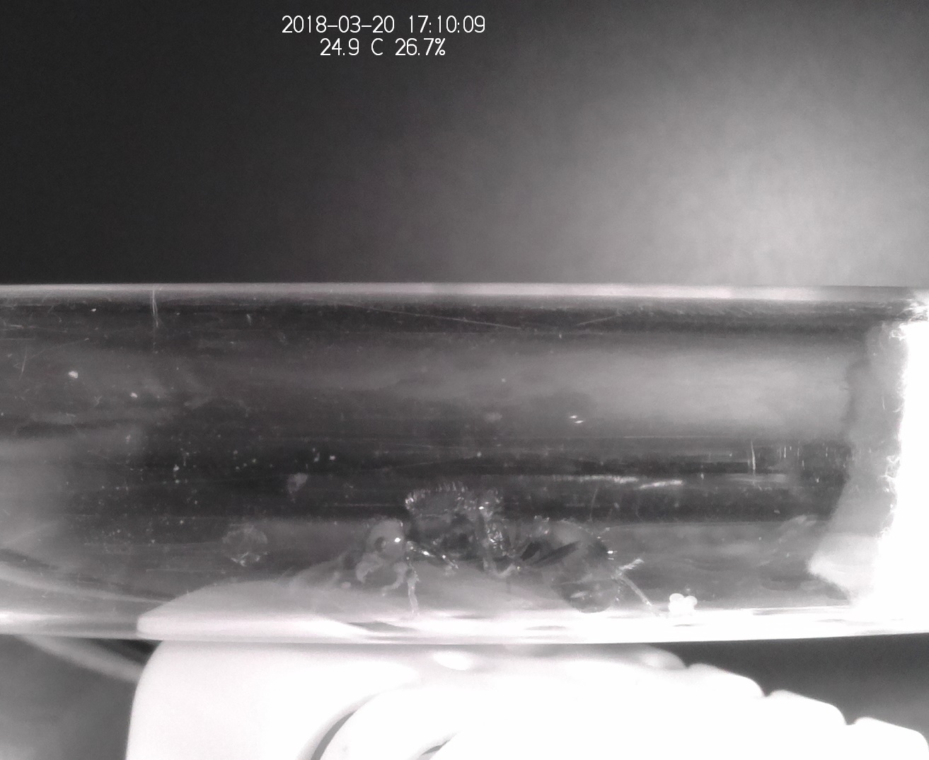 Ich habe eine (Infrarot) Kamera mit Infrarot LED auf die Messor barbarus Königin während der Gründung gerichtet.