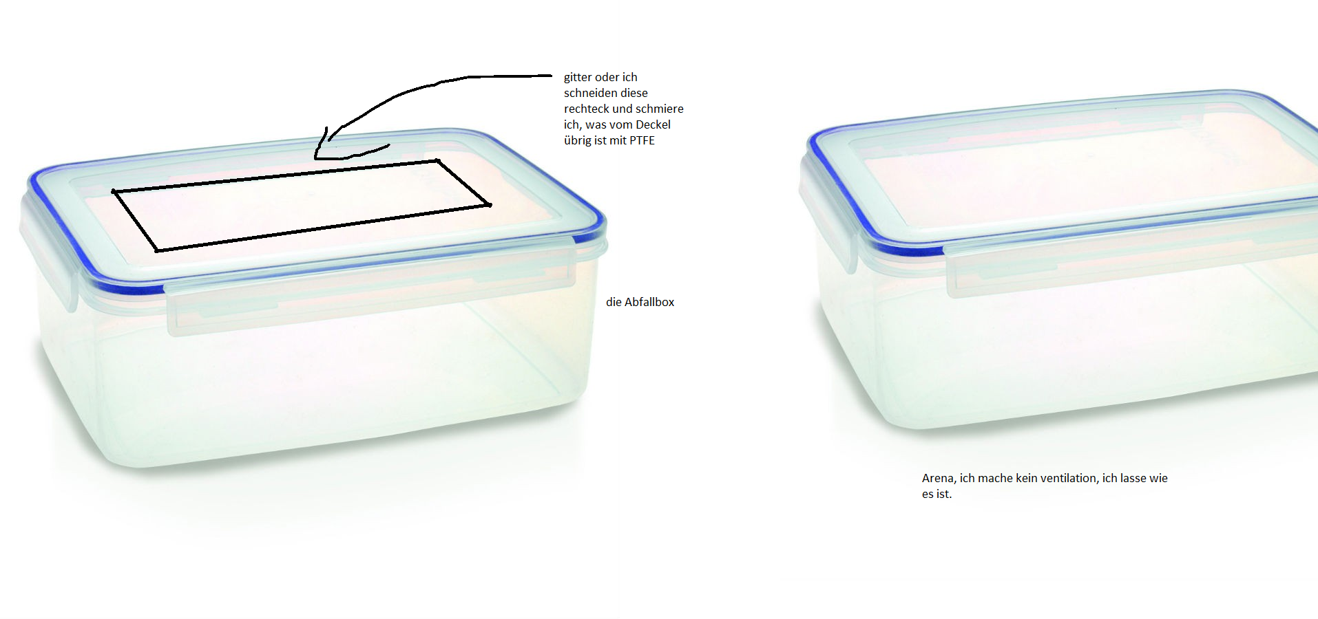 Hier is arena (outworld, I weiss nicht wie heisst das in DE:)) und Abfallbox. Abfallbox wird vereint mit dem schlange(25 cm) und arena mit 15cm schlange.