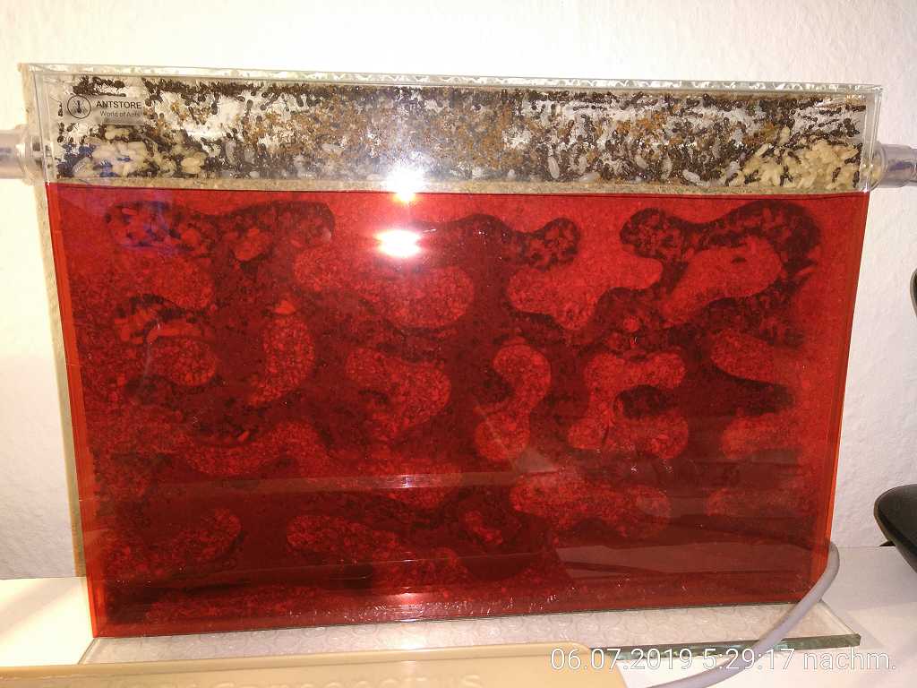 Gestartet habe ich letztes Jahr mit einer Köigin, 4 Arbeiterinnen und ein wenig Brut. Danke auch an den Antstore, sie sind alle unversehrt angekommen und leben wahrscheinlich heute noch. Der Anfangsaufbau war auch vom Antstore, eine Glasarena 20x20x30 (immer noch die einzige Arena im Aufbau) und ein Glasnest 20x30x2 mit Korkeinsatz. Am Anfang ging es dann, wie erwartet, relativ langsam. Habe das Reagenzglas in die Arena gelegt und den Rest ihnen überlassen. Ich störe sie grundsätzlich immer nur, wenn es unbedingt sein muss. Die rote Folie habe ich z.B. noch nie angehoben. Mit einer Taschenlampe und einer Lupe kann man auch so fast alles erkennen. Nach ca. 3 Wochen haben sie dann endlich den Nesteingang gefunden und sind in derselben Nacht umgezogen. Danach ist wieder lange nicht viel passiert. Ich habe sie immer oben auf dem Korkeinsatz mit Heimchen und allem was ich fangen konnte gefüttert. Bei nicht mal 10 Arbeiterinnen wollte ich den Weg zum Futter möglichst kurz halten. Das hat auch gut funktioniert. In der Arena waren sie deshalb auch nur zum Trinken von Wasser und Zuckerwasser. Zum Futter und allem, was dazugehört, schreibe ich gleich noch etwas ausführlicher. Nach 3 Monaten waren es dann schon 15, nach 4 Monaten 34 und nach 5 Monaten ca. (!) 70. Ab dem Moment hat die Population rasant zugenommen und sie haben meine Erwartungen und Schätzungen diesbezüglich immer weit übertroffen. Nach 6 Monaten waren es knapp über 200. Genaues Zählen war da aber schon lange nicht mehr möglich. Dafür ist immer viel zu viel Gewusel im Nest. Kleiner Tipp: Auf einem Foto kann man sie am besten zählen. Nach 7 Monaten waren es mehr als 400 und nach 8 Monaten mehr als 800. Seitdem kann ich nur noch grob schätzen und auch Fotos helfen nicht mehr. Nach 9 Monaten waren es aber bestimmt weit über 1.000 und heute nach 10 Monaten bin ich mir sicher, dass die 2.000er-Marke entweder schon geknackt wurde oder bald geknackt sein wird.