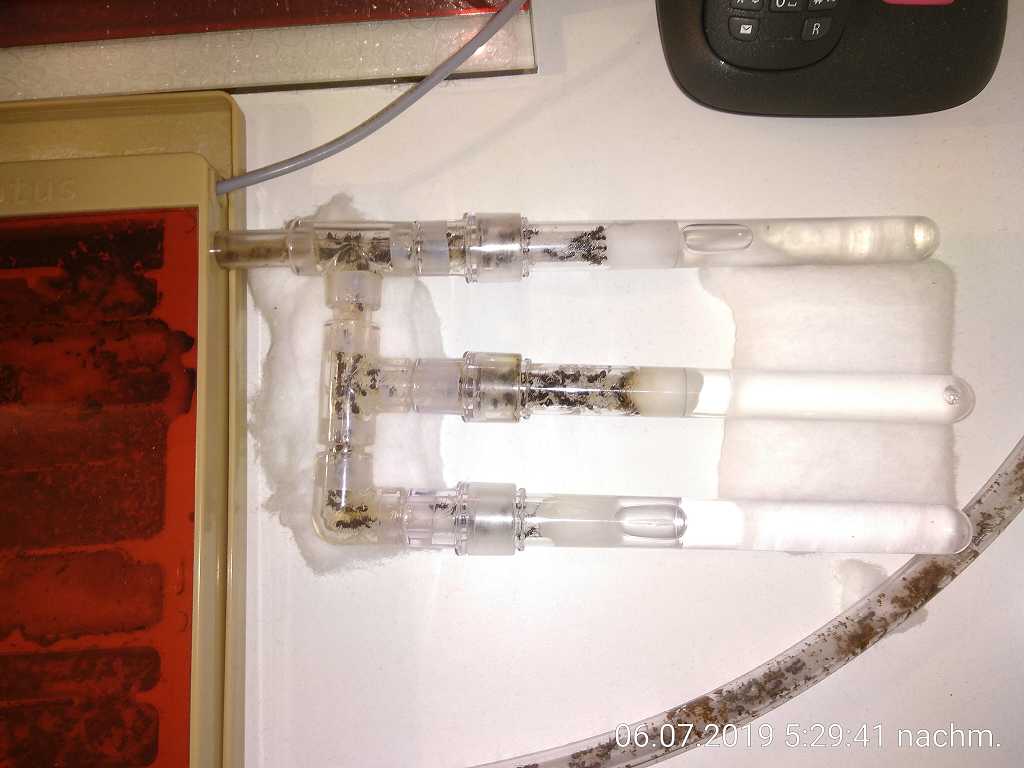 Mit der Zeit sind sie dann immer mutiger geworden und heute gehen sie neugierig oder verteidigend auf Neues in der Arena zu. Meistens ist es ja nur Futter. Ansonsten breiten sie sich immer mehr in der ganzen Anlage aus und besetzen auch alle Verbindungsschläuche dauerhaft. Für sie gehört wohl mittlerweile allles außerhalb der Arena zum Nest. Ist ja auch ein geschlossenes System. Teilweise liegt sogar Brut in den Schläuchen. Was sie für sich beanspruchen, besetzen sie einfach Tag und Nacht mit Arbeiterinnen.