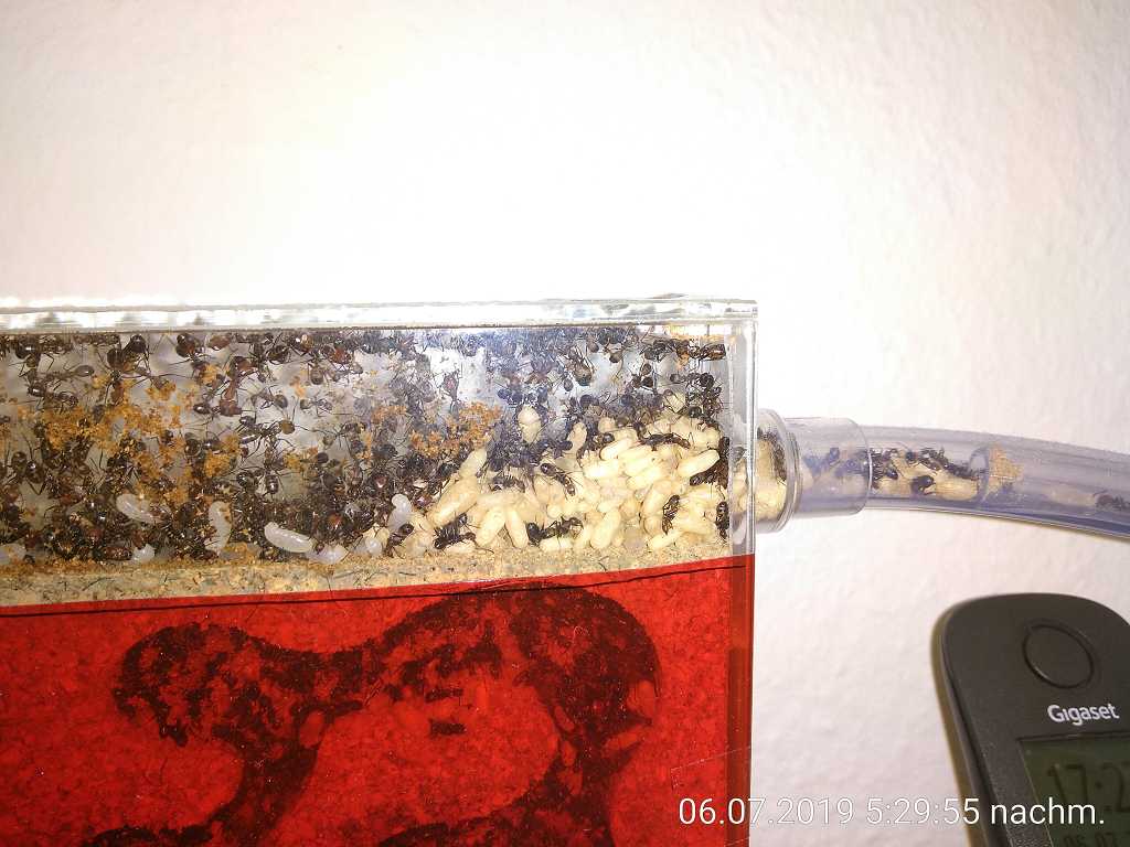 Die Temperatur habe ich anfangs gar nicht beeinflusst, es war ja ein wirklich heißer Sommer und bei mir im Wohnzimmer waren es immer über 25°C. Im Herbst habe ich dann hinter der bis dahin völlig ungenutzten Seite des Nests eine kleine Heizmatte (ca. 10x15) angebracht. Nach einer Stunde sind sie auf diese Seite umgezogen und haben da auch immer noch mehr Brut als auf der anderen Seite! Den Rest des Nests heize ich aber trotzdem nicht, so haben sie immer mehrere "Klimazonen" und können die Brut je nach Raumtemperatur umlagern. Zur Zeit ist die Heizung übrigens wieder aus. Schreibe jetzt bei angenehm kühlen 27° aus meinem West-Wohnzimmer mit viel Fensterfläche. Nicht dass ihr mich falsch versteht, mir und den Ameisen gefällt's so gut.