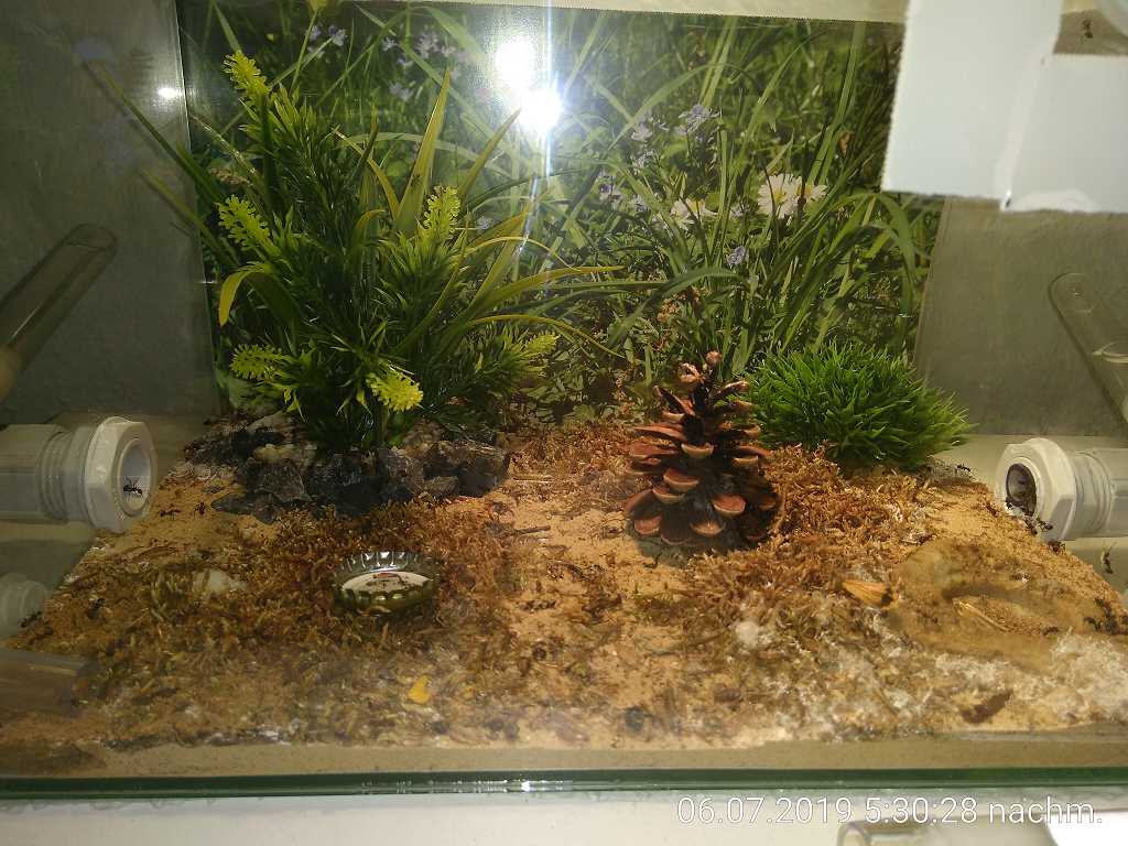 Ach so, in die Arena habe ich übrigens eine dünne Sand-Lehm-Schicht eingestreut, ein bisschen trockenes Moos, das ich nur manchmal befeuchte, 2 kleine grüne Plastikpflanzen (weil einfacher), einen Tannenzapfen und eine kleine Steintränke, die ich aber mittlerweile (s.o.) als Futternapf nutze.