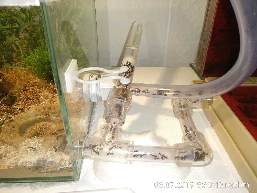 Zum Aufbau gehören sonst nur noch ein paar Schläuche, die die Nester mit der Arena verbinden und ein paar Reagenzgläser (dazu gleich mehr), die ich auch ins System integriert habe. Ich war mir erst unsicher, ob man die deutschen mit den amerikanischen Schläuchen verbinden kann, aber es geht. Am besten kauft man sich jeweils 2 bis 3 unterschiedliche Durchmesser. Die kann man dann einfach ineinanderschieben. Bei mir hält das ohne Hilfsmittel seit Monaten ohne irgendwelche Probleme. Der Grund für diesen ganzen Mischmasch war, dass meine Ameisen Wasser und Zuckerwasser nur aus dem Reagenzglas (mit Watte) angenommen haben. So wie sie es als kleine Kolonie gelernt haben. Tränken jeglicher Art wurden komplett ignoriert. Ich möchte aber aus ästhetischer Sicht nicht dauerhaft mehrere Reagengläser in der Arena liegen haben. Daher wollte ich die Dinger außen anschließen. Und das funktioniert super. Wegen des Anschluss-Systems kann ich die Reagenzgläser einfach tauschen, wenn sie leer sind. Ich gebe ihnen auch immer ein komplett leeres. Das nutzen sie dann als Müllhalde. Wenn es voll ist, bekommen sie ein neues leeres. Das ist total praktisch. Ein anderer großer Vorteil ist, dass das Wasser nur sehr langsam oder eigentlich fast gar nicht verdunstet. Gibt man ihnen nur ein Gläschen, halten sie es je nach Koloniegröße bis zu mehreren Wochen damit aus. Meine brauchen aber mittlerweile ein bis 2 volle Reagenzgläser pro Woche. Trotzdem kann ich sie so ohne Probleme mehrere Tage alleine lassen, ohne dass ich mir um Wassermangel sorgen machen muss.