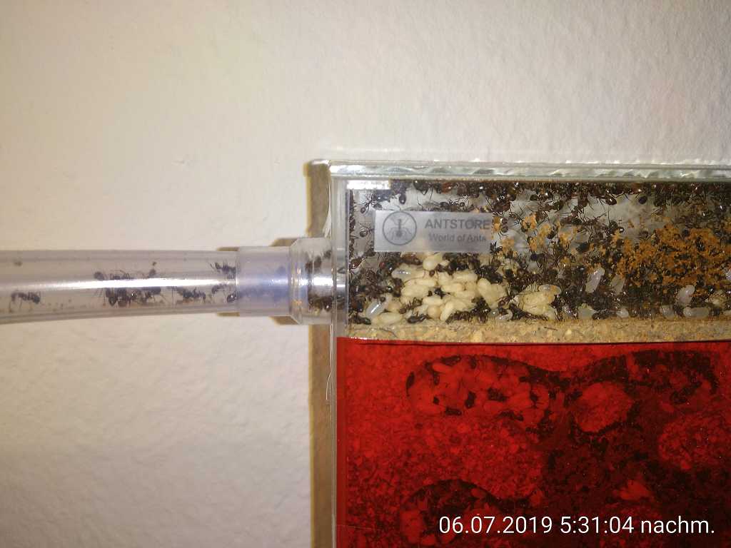 Wie oben schon erwähnt, habe ich mit einem Antstore-Starter-Kit begonnen. Das Nest und die Arena stehen auch immer noch, wurden aber durch einige Elemente ergänzt. Das erste Nest ist mittlerweile voll, zumindest haben sie sich überall ausgebreitet. Sie haben sogar im äußeren, hellen Bereich Brut angehäuft. Und ich habe noch ein zusätzliches liegendes Nest von AntsCanada, das man befeuchten kann, angeschlossen. Das wurde auch ziemlich schnell bevölkert und heute liegen da bestimmt auch 100 bis 200 Puppen plus Larven und Eier drin, voll ist es aber lange noch nicht. Ich lese zwar überall, dass sie es trocken mögen, hatte aber irgendwie das Gefühl, dass ich ihnen ein Nest mit höherer Luftfeuchtigkeit anbieten sollte. Hätten sie es nicht gemocht, hätte ich schließlich auch einfach mit dem Bewässern aufhören können. Anscheinend mögen sie es aber, zumindest für einen Teil der Brut. Ich überlege deshalb, ihnen auch mal ein Nest mit Erde zum Graben anzubieten. Laut allem, was man hört, graben sie ja nicht gern, aber probieren kann ja nicht schaden. Vielleicht überraschen sie mich ja wieder. Werde vom Test berichten.