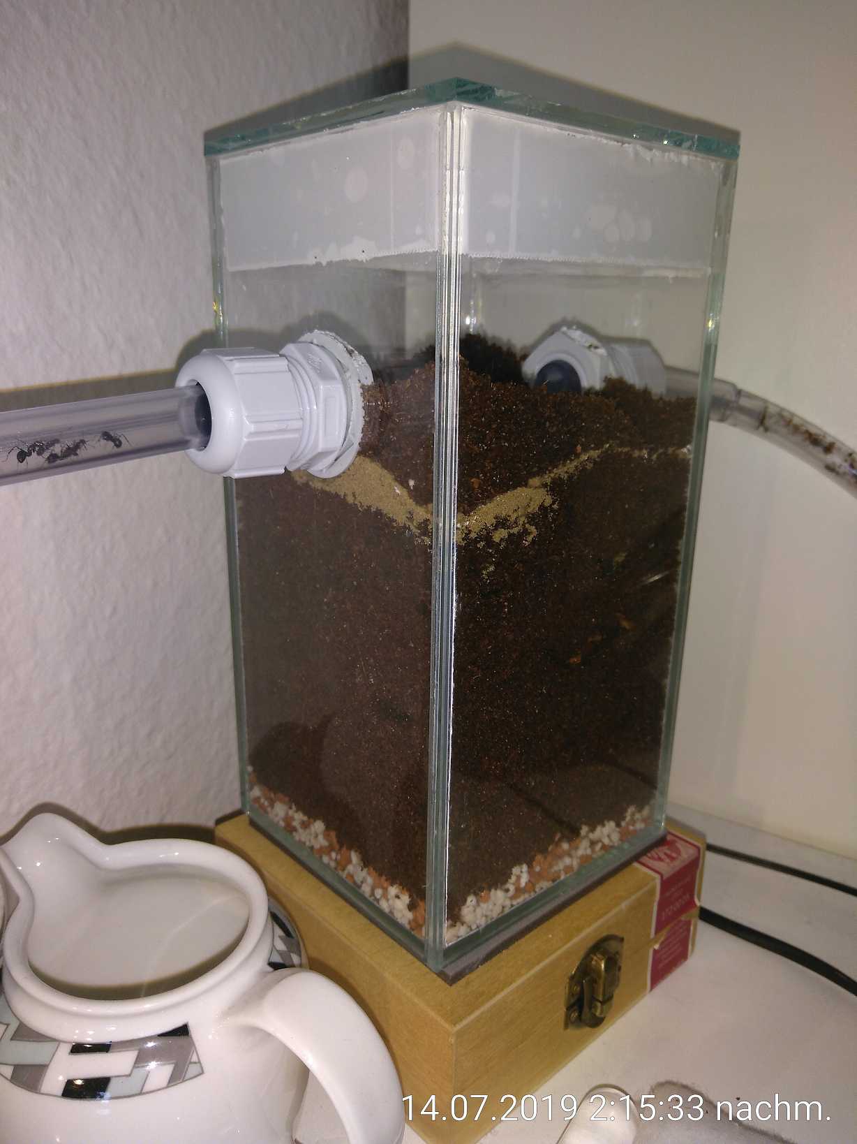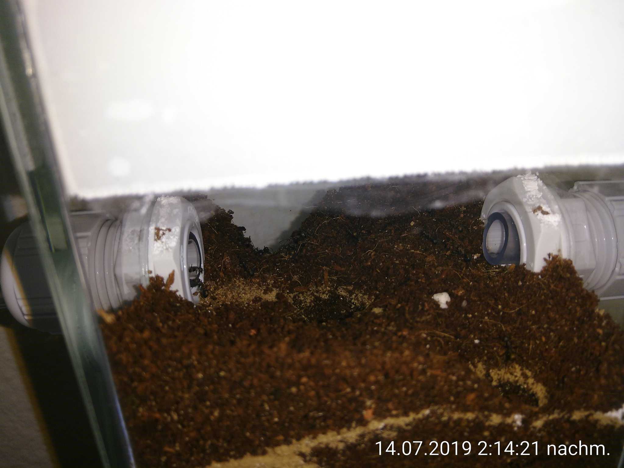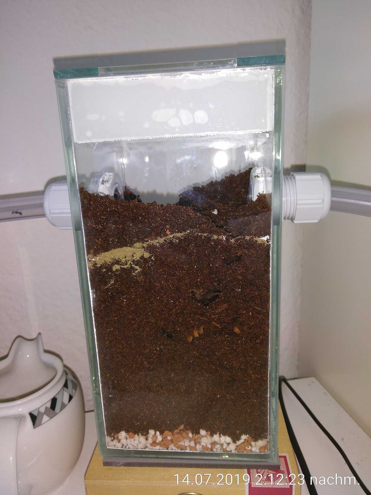 Bezüglich der Luftfeuchtigkeit habe ich nichts unternommen, mal abgesehen von der Befeuchtung des zweiten Nests. In der Arena lag sie eigentlich immer so um die 50 %, schwankend zwischen 40 und 60, ganz normale Raumluftfeuchte also. Ich schätze aber, dass sie im ersten Nest mittlerweile auch höher als normal ist, ein bisschen Feuchtigkeit kann ich darin erkennen, aber nicht so viel, dass die Scheiben beschlagen würden. Dafür sind die Ameisen aber selbst verantwortlich, also unternehme ich nichts dagegen.