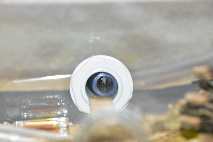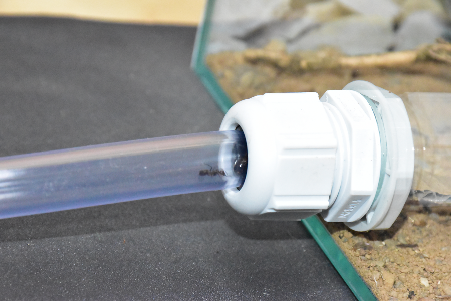 Meine Ameisen halten sich mittlerweile nur noch in dem Adapter von Arena zum Schlauch hin auf. Klar, dort ist es etwas Lichtgeschützt. Jetzt zu meiner Beichte, vor einer Woche habe ich einen Zwangsumzug durchgeführt. Sprich, ich habe den Schlauch mit den Ameisen direkt über dem Gipsnesteingang gehalten. Nach und nach sind sie dann auch rein und haben es dort tatsächlich 12 Stunden ausgehalten, danach sind sie wieder in den Adapter. Ich weis, Geduld hatte ich bisher viel aber ich heiz die Hütte ja nicht umsonst