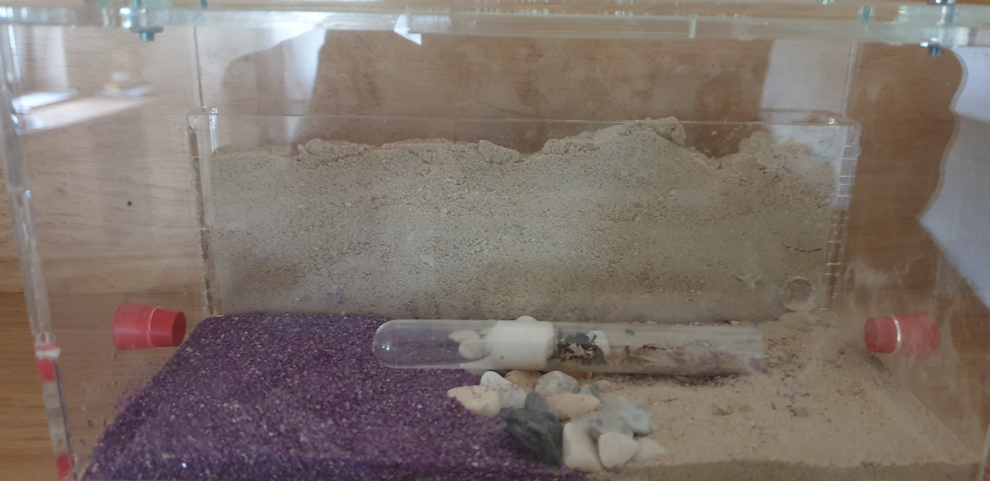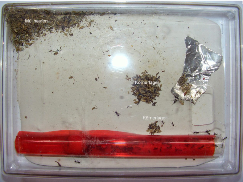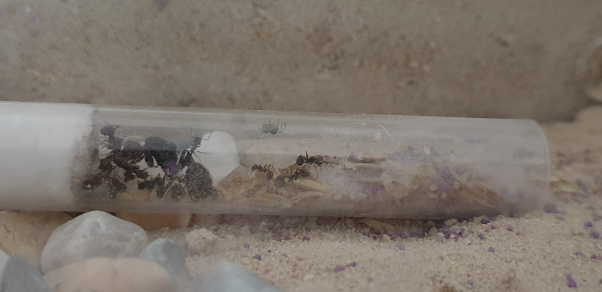 Ich achte darauf dass immer genug Wasser und Körner zur Verfügung stehen und reinige auch immer mal wieder die Arena. Hin und wieder befeuchte ich das Formicarium für die Larven und dass für die Körner (wenn auch noch nicht von den Ameisen genutzt) lasse ich in Ruhe.