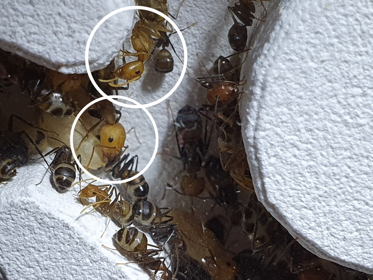 vielleicht kann mir jemand helfen. Ich habe seit etwa einem Jahr eine Camponotus nicobarensis Kolonie mit rund 300 Arbeiterinnen. Vor kurzem hab ich allerdings Arbeiterinnen (??) entdeckt, die ganz anders aussehen, ich hab ein Foto angehängt. Sie sind etwa doppelt so groß wie die anderen und haben überdimensinal große Köpfe mit großen Augen und echt großen Mandibeln. Es sind etwa ein Dutzend und sie verlassen das Nest nie. Sie beteiligen sich auch scheinbar nicht oder kaum am aktiven Geschehen im Nest, sie sitzen zumeist an einer Stelle und halten Larven/Puppen fest und bewegen sich nur wenig im Nest. Ich weiß, dass frisch geschlüpfte Ameisen auch fast weiß sind und nachfragen. Solche hab ich auch sehr viele im Nest, aber diese hier sind halt anders und wie gesagt, viiel größer. Der Kolonie geht es gut und sie vermehren sich prima. Auch die Königin scheint wohlauf zu sein, keine Auffälligkeiten. Kann mir vielleicht jemand sagen, warum diese paar wenigen so anders aussehen und welchen Zweck sie erfüllen innerhalb der Kolonie?