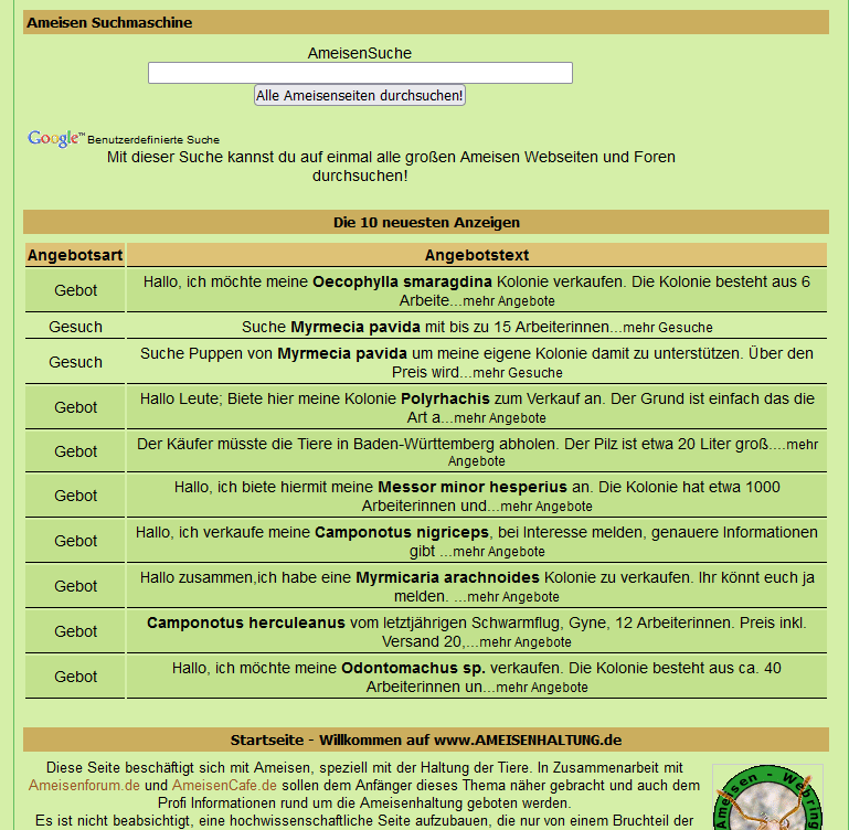 Nachdem die Ameisenbörse ( ursprünglich auf Ameisenhaltung.de ) nun aber nicht mehr im Dienst ist,