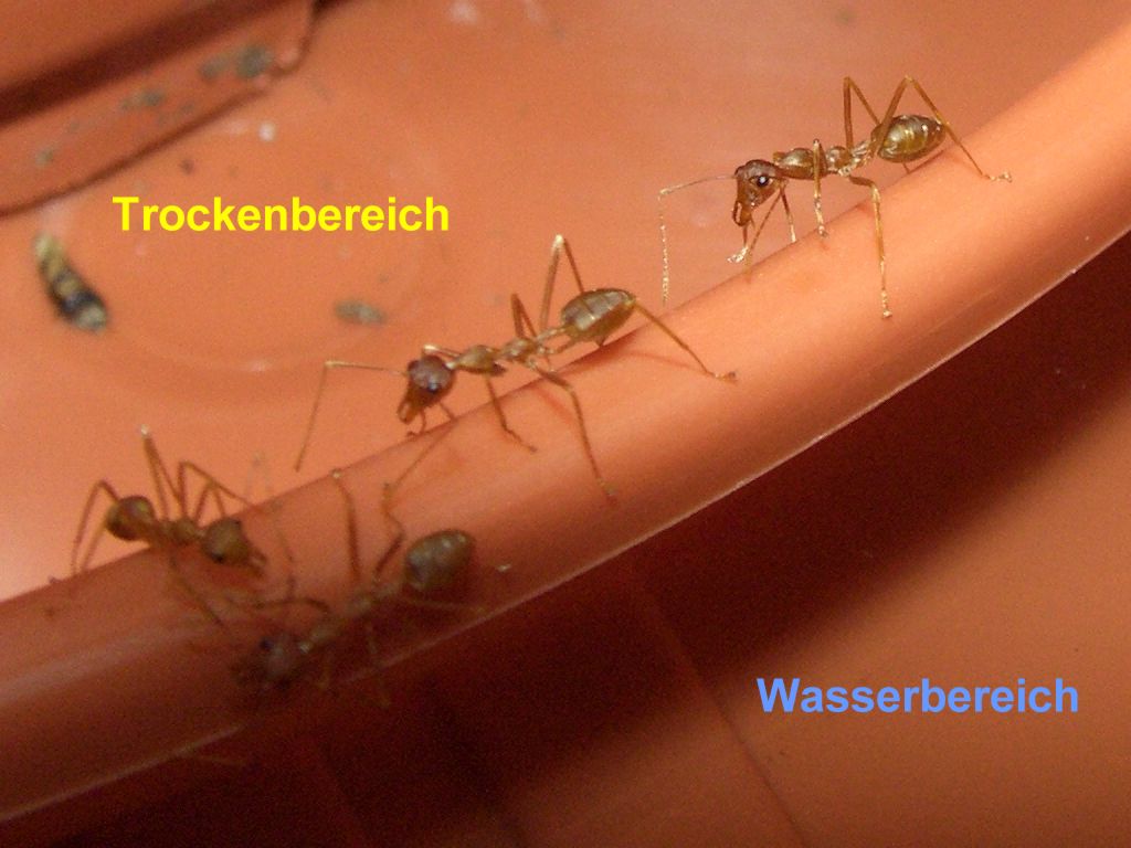 Als Ausbruchssicherung dient ein Wassergraben, bestehend aus 2 Kunststoff Blumenuntersetzern, wobei der Äußere mit Wasser gefüllt ist.