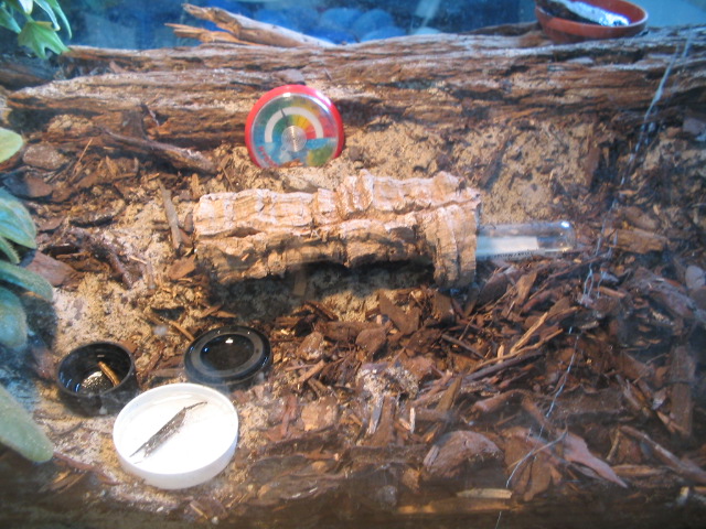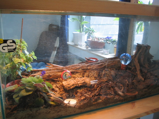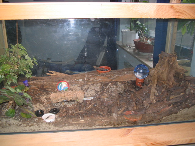 Die Bodenschicht besteht aus einer Sand - Rindenmulch Mischung die zwischen 2 und 15 cm dick ist. Ein großes Stück Wurzelholz und ein weiteres großes Stück Buchenrinde sind im Becken vorhanden.