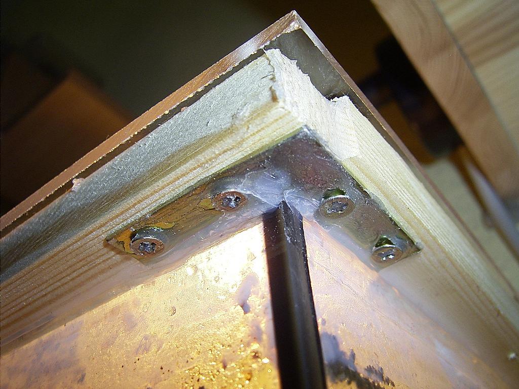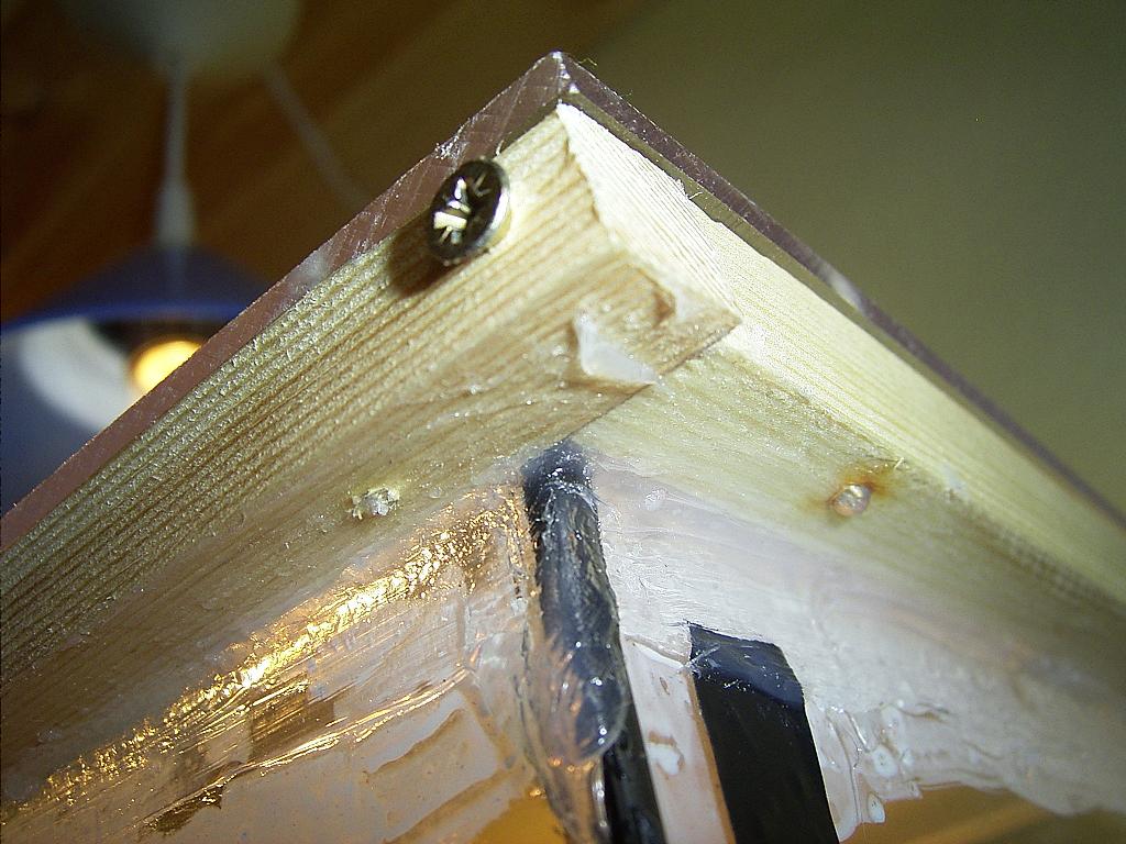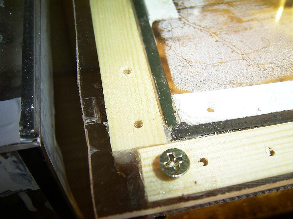 Nun schneidet ihr die längeren seiten vom Rahmen 3cm länger als die längste seite des Formicariums ab und die kürzeren seiten genau so lang wie die kürzere Seite vom Becken. Dann bohrt ihr die Schraubenlöcher am besten vor damit euch nix kaputt geht beim zusammschrauben. am besten mit 4mm vorbohren und 5mm Holzschrauben mit etwa 25-30mm länge benutzen. Dann den Rahmen mit Silikon auf dem Becken einpassen sodass die Plexiglasscheiben hinterher nur auf dem Holz aufliegen. Wenn dann das Silikon fest ist, den Deckel drauflegen und die Bohrungen für die Verschraubnung der Scheibe bohren (2-4mm Bohrer dann 3-5mm Schrauben)